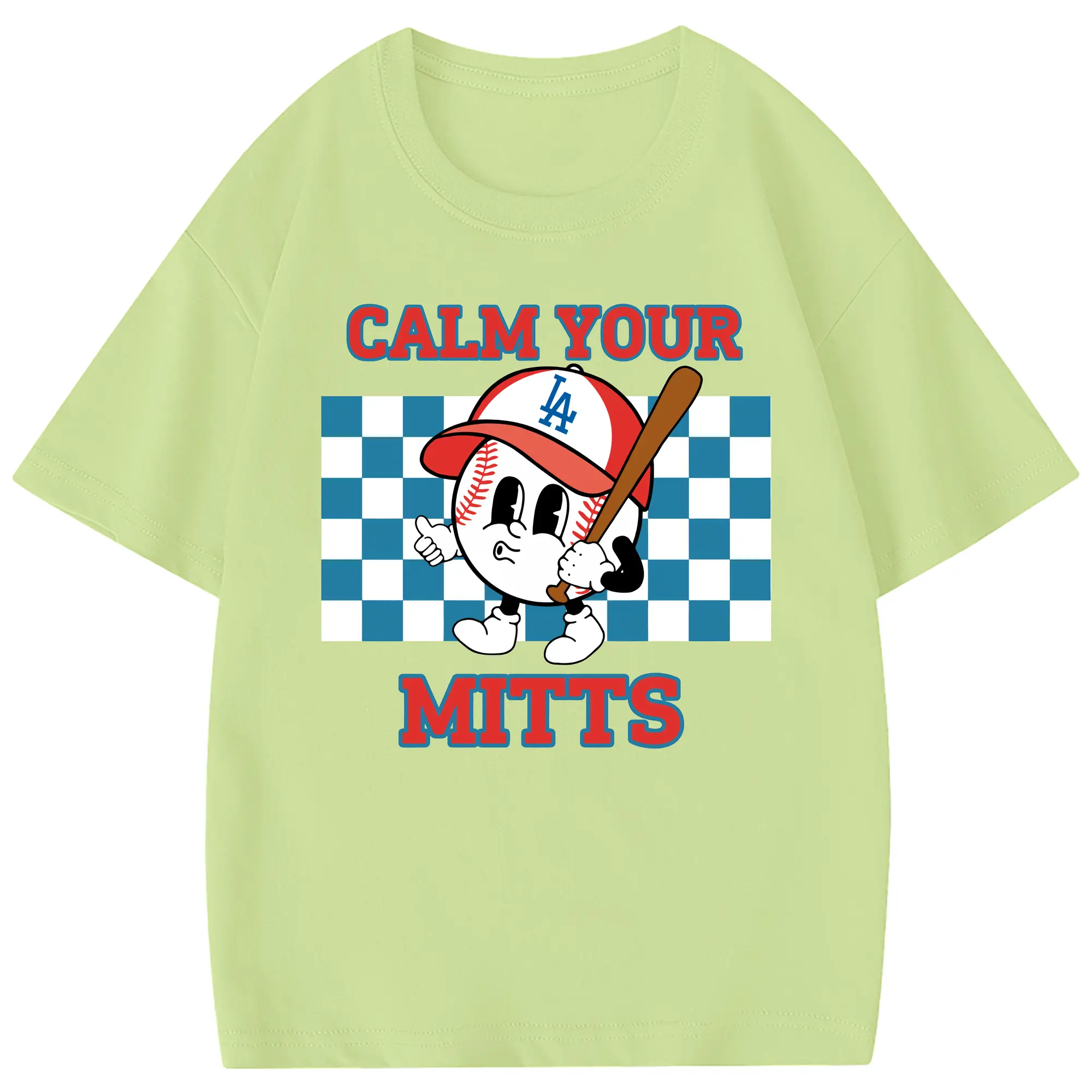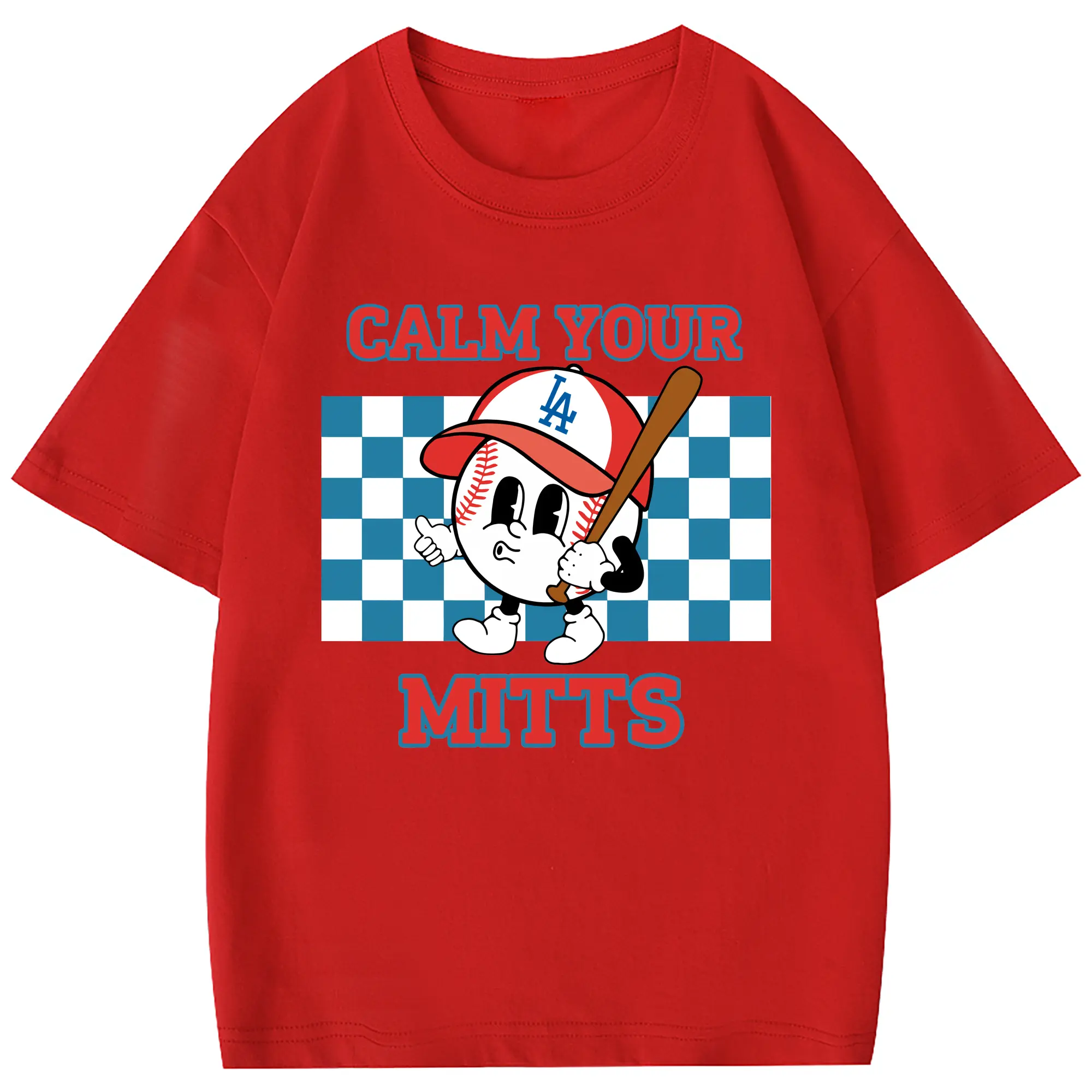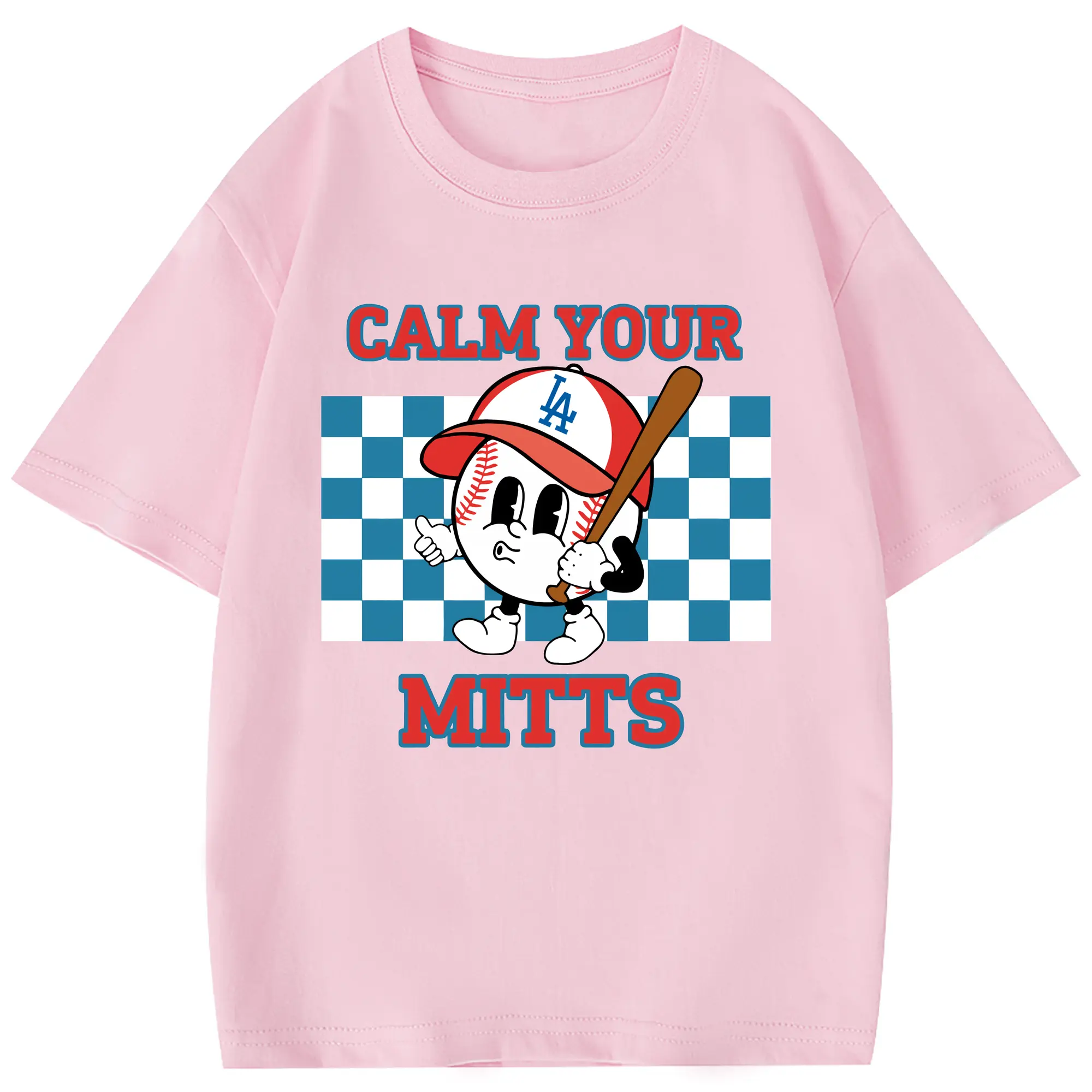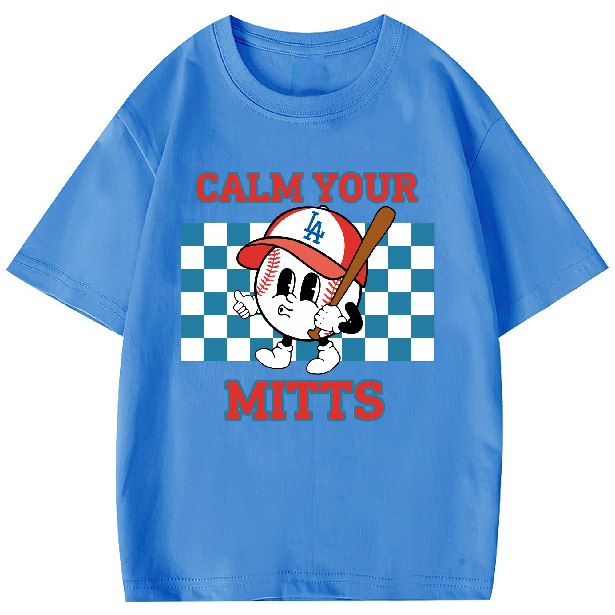 Baseball Calm Your Mitts Los Angeles Dodgers - Combed Cotton Kids T-Shirt 180g With Front Heat Transfer Print – Soft, Lightweight, Side-Seamed Design – Stylish And Comfortable Casual Wear For Everyday Activities