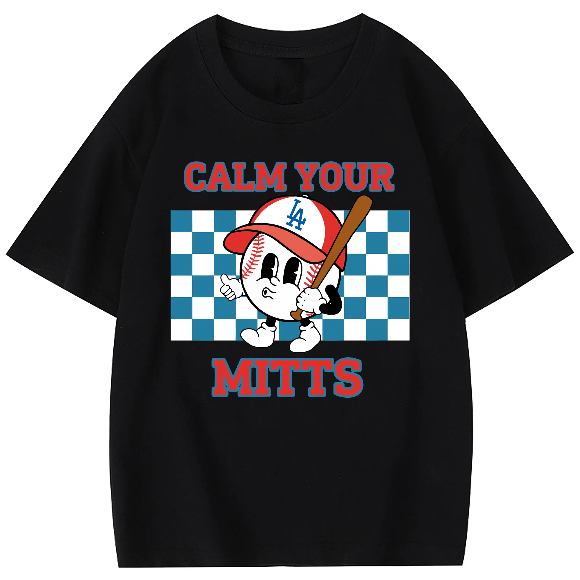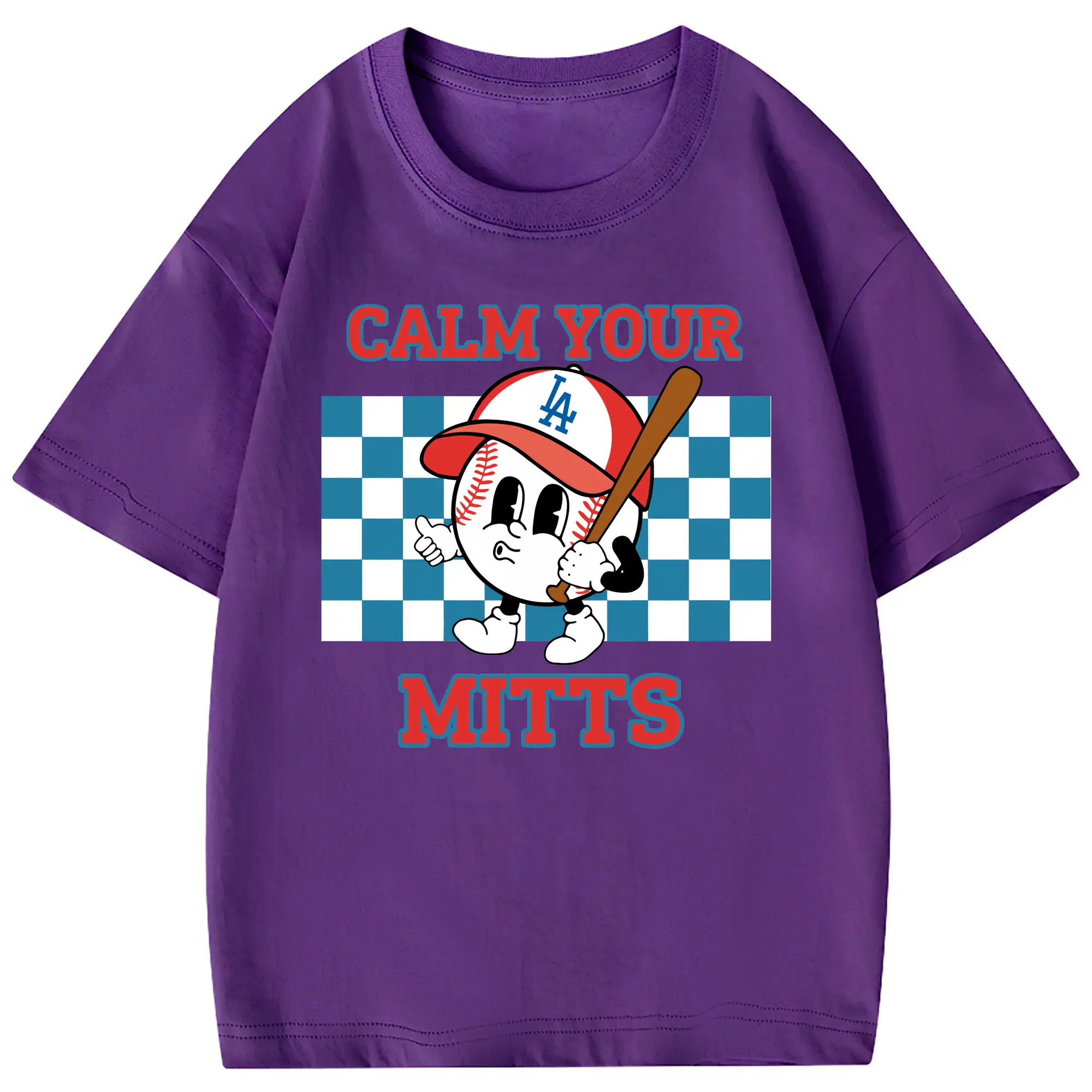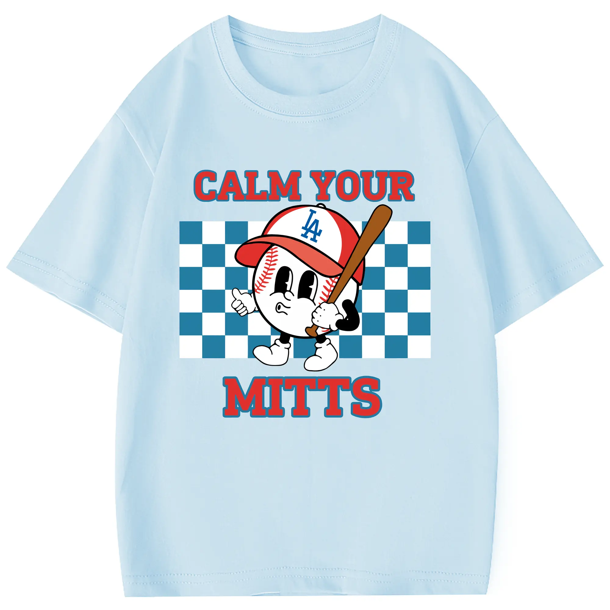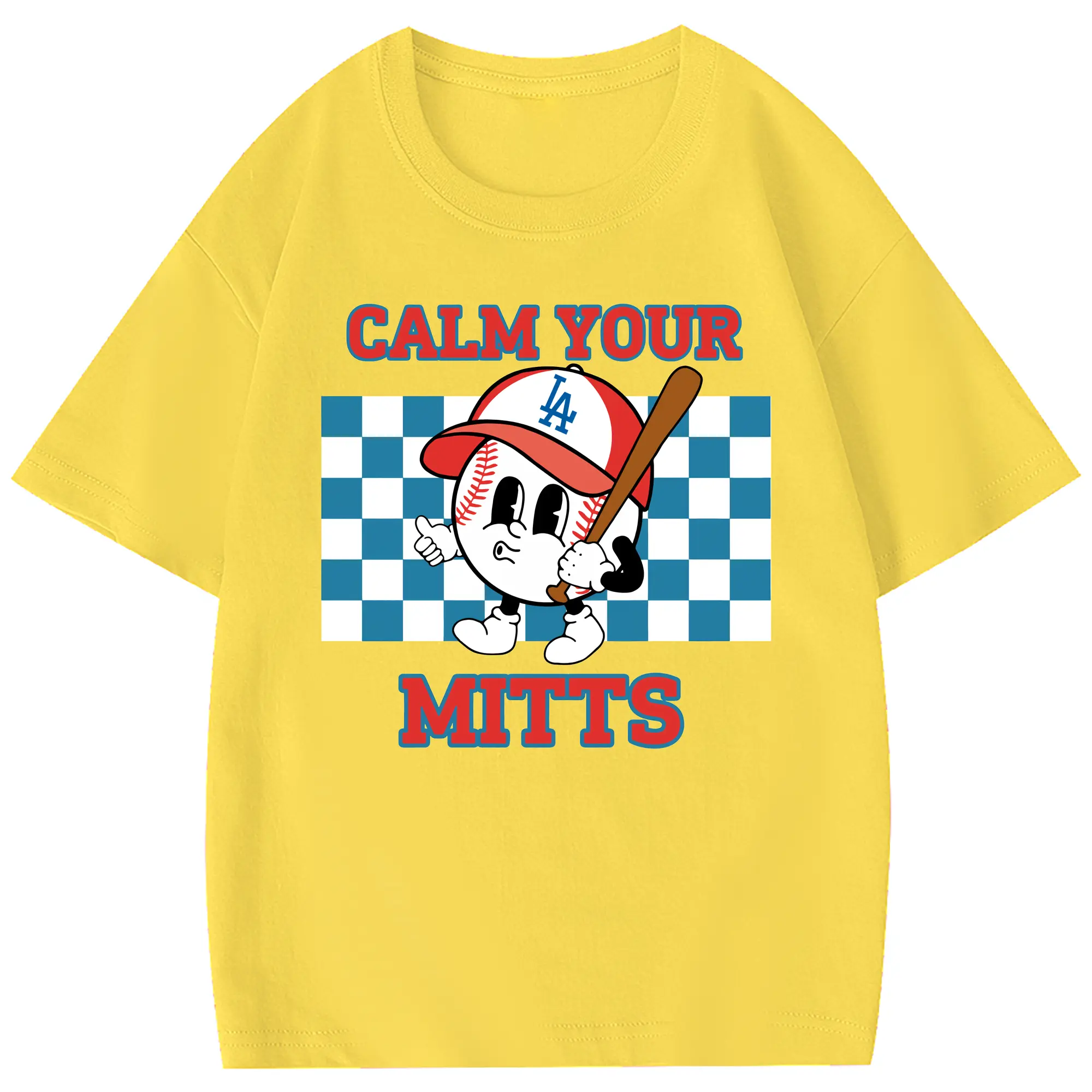 Baseball Calm Your Mitts Los Angeles Dodgers - Combed Cotton Kids T-Shirt 180g With Front Heat Transfer Print – Soft, Lightweight, Side-Seamed Design – Stylish And Comfortable Casual Wear For Everyday Activities