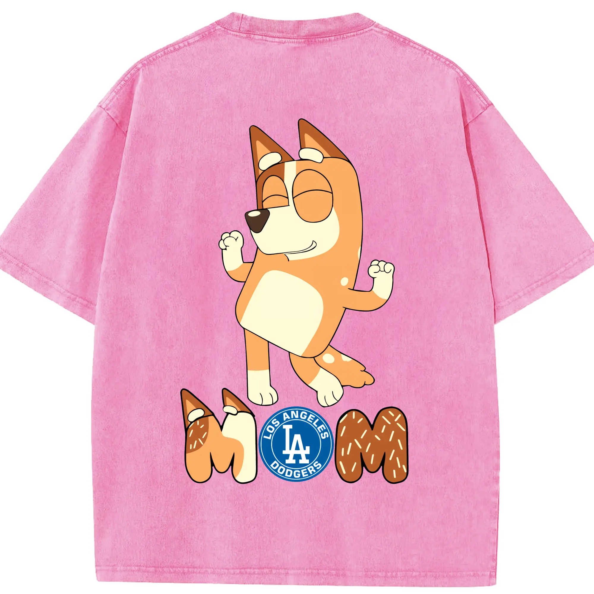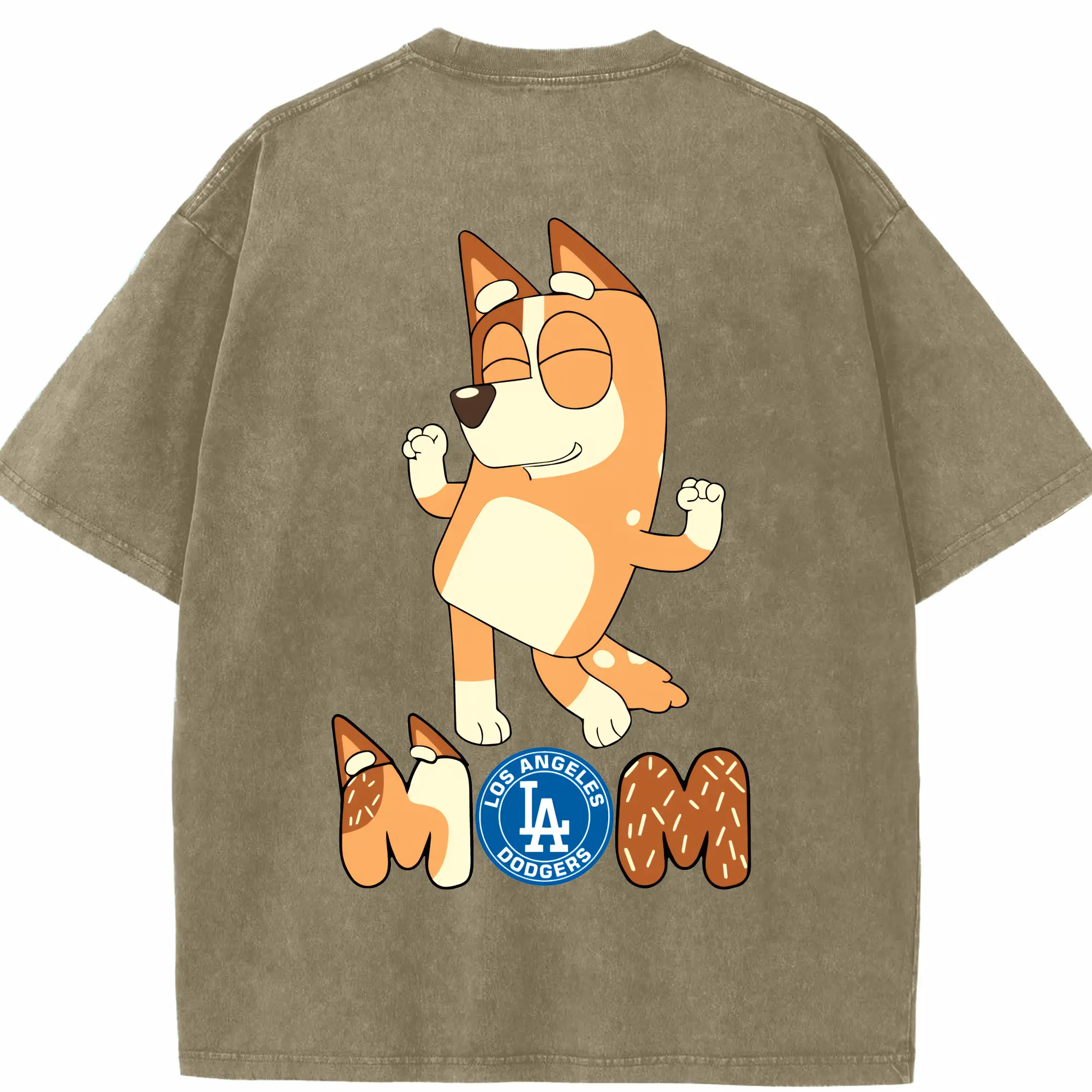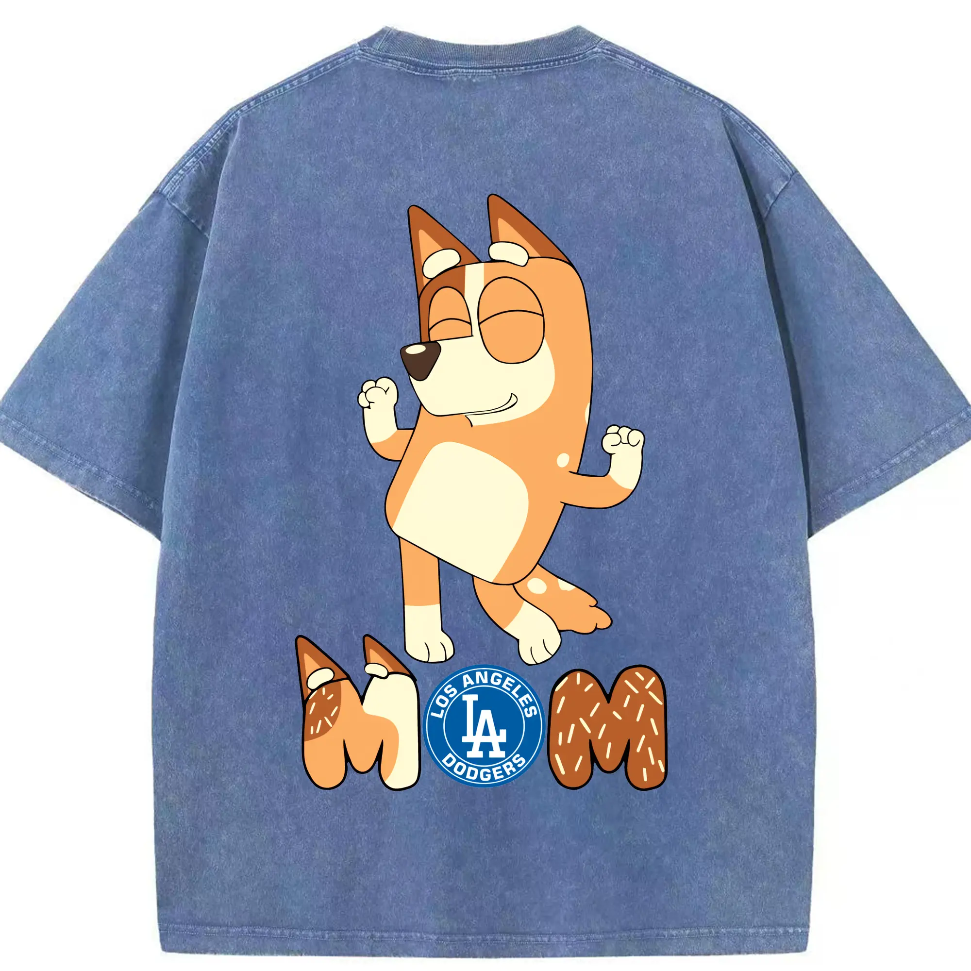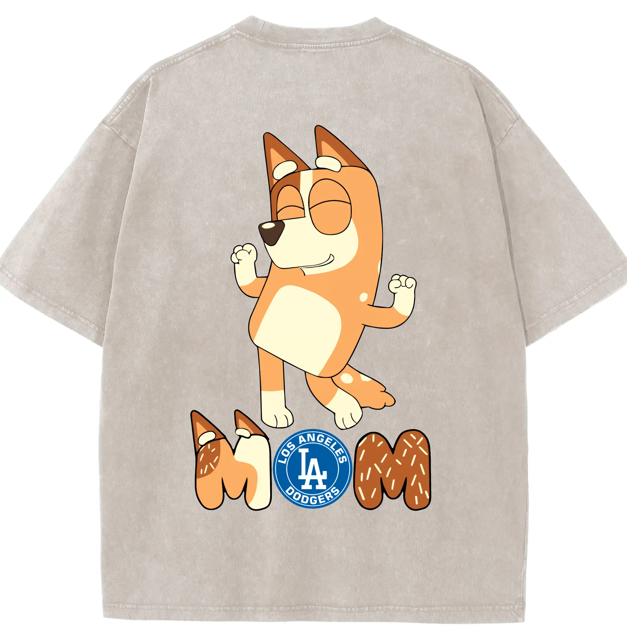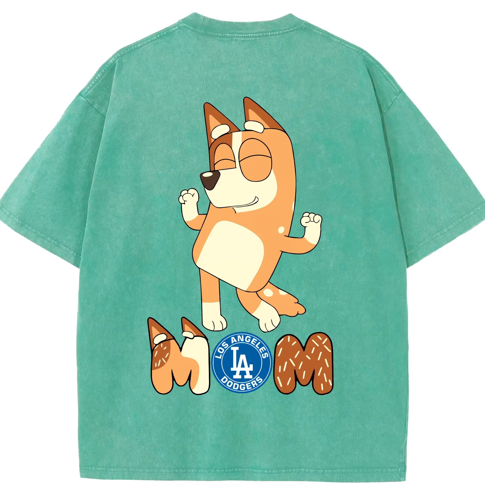 Bluey Mom Los Angeles Dodgers Baseball - Washed Vintage 230g Cotton Oversized T-Shirt With Back Heat Transfer Print – Soft, Lightweight & Stylish – Comfortable Casual Wear For Sports & Everyday Use