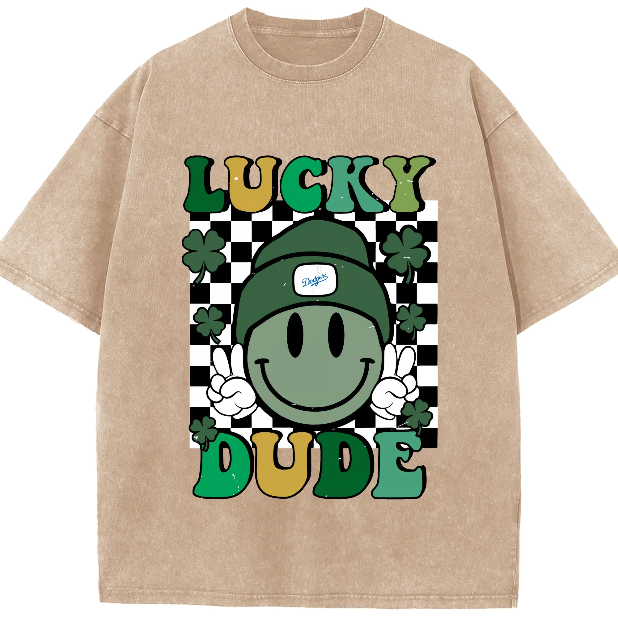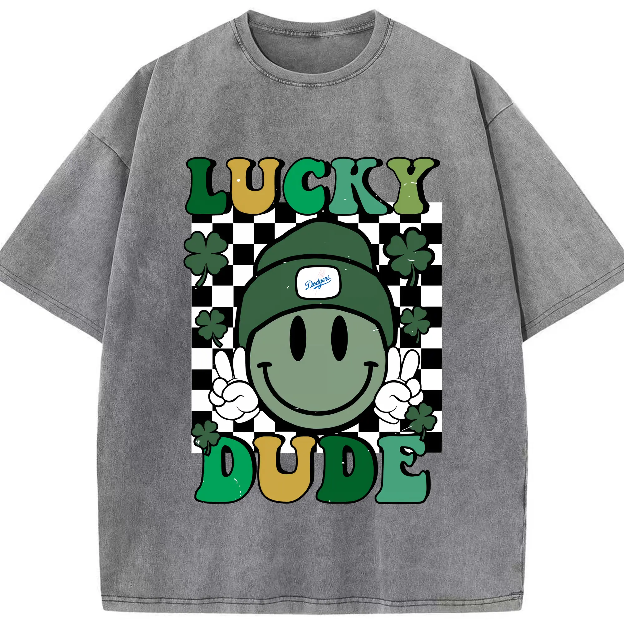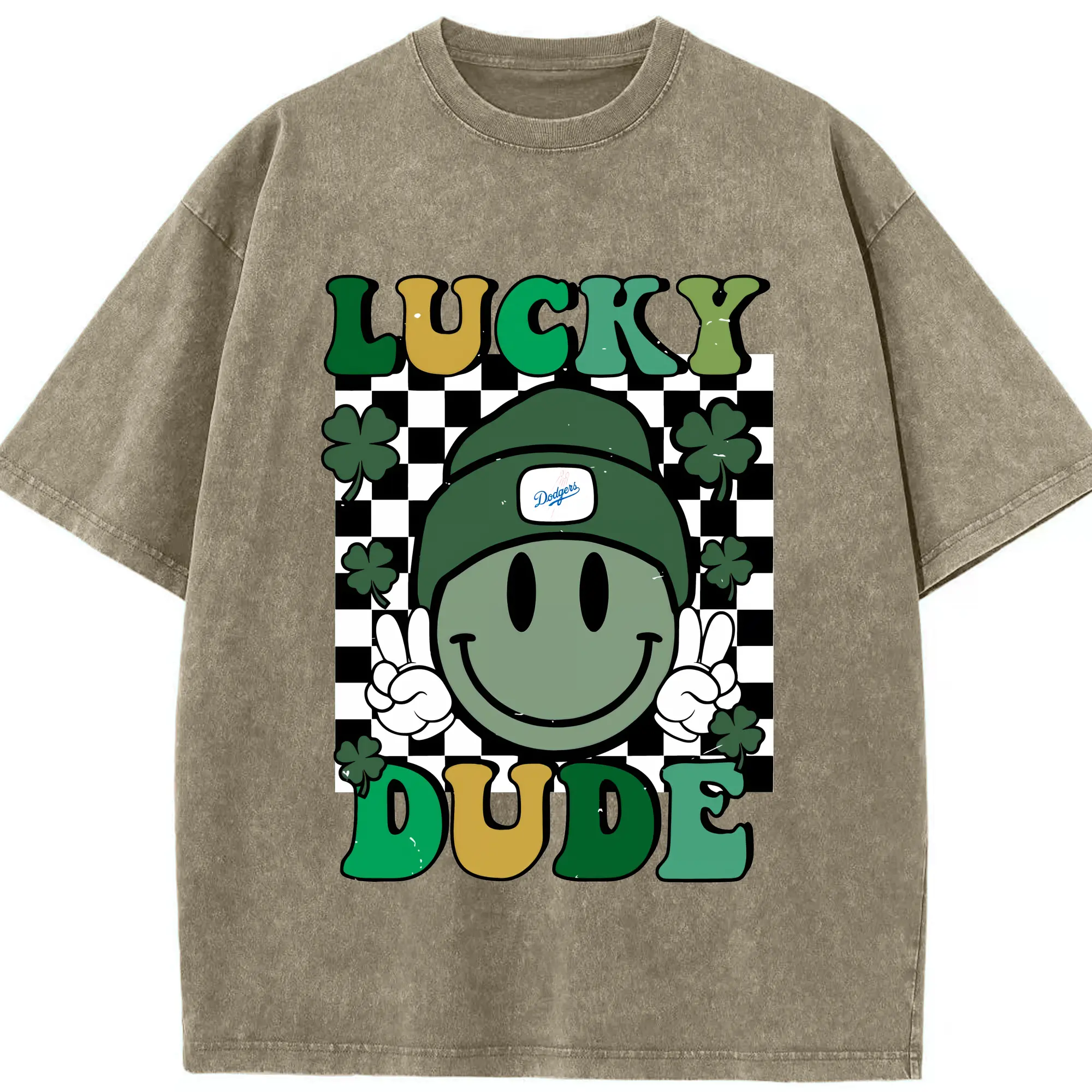 Happy Face Lucky Dude Los Angeles Dodgers - Washed Vintage Look 230g Cotton Oversized T-Shirt With Front Heat Transfer Print – Soft, Lightweight, Stylish Fit – Comfortable Casual Wear For Sports & Everyday Use