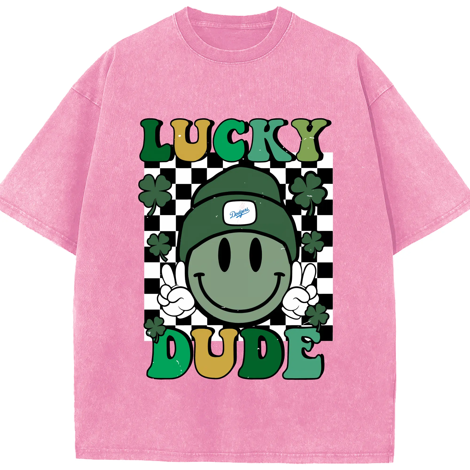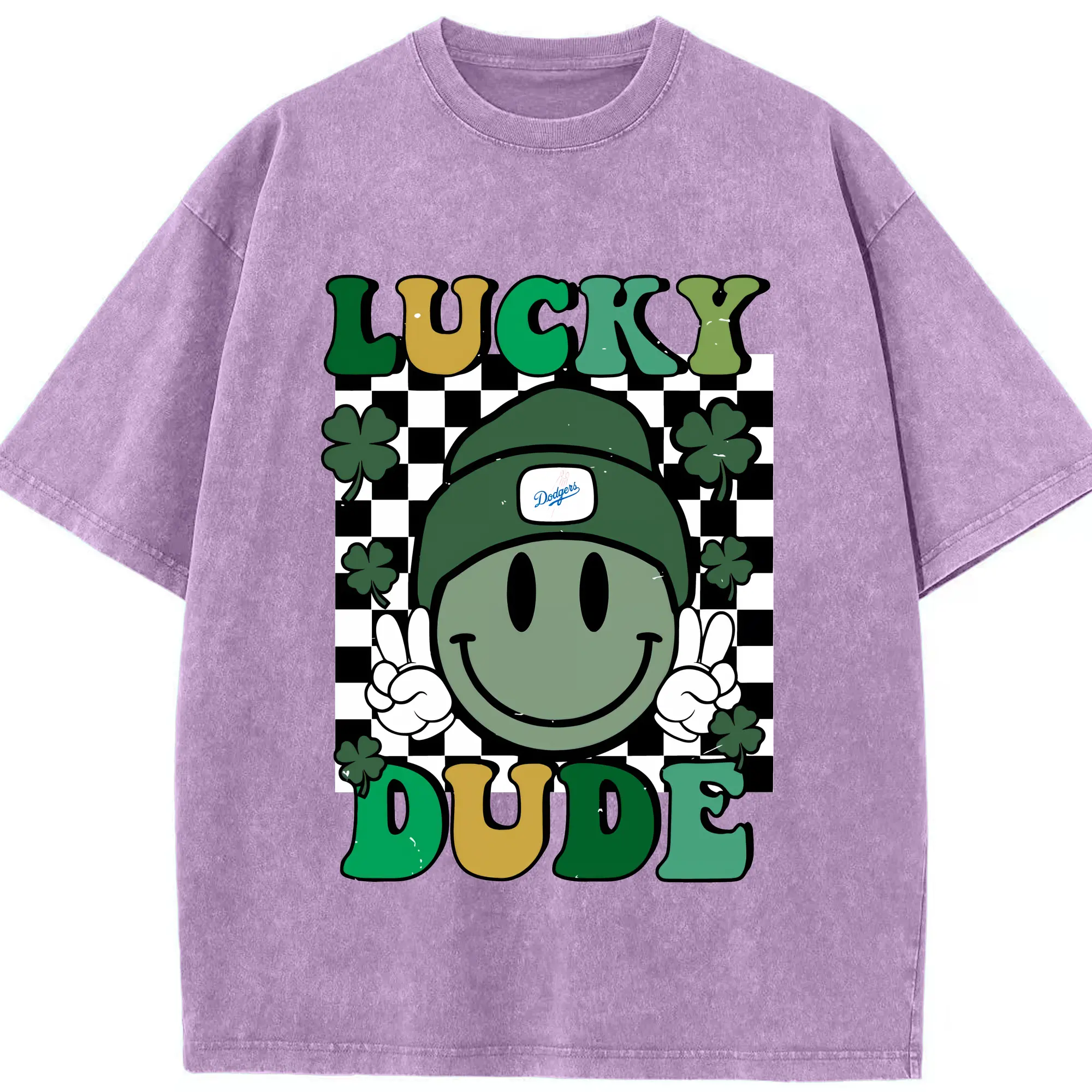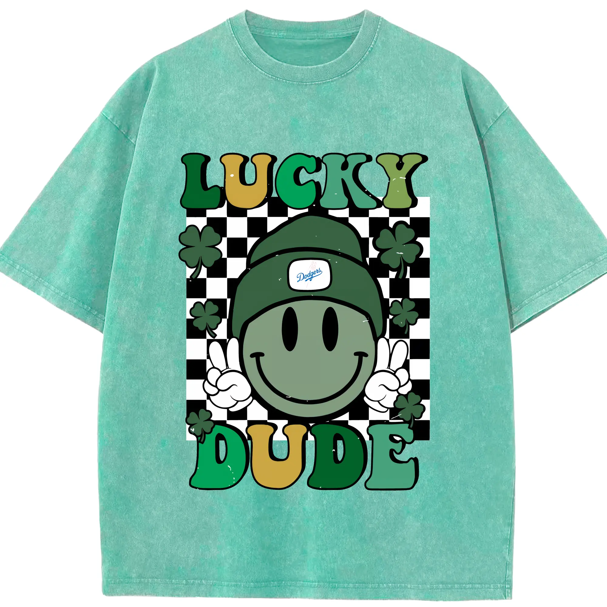 Happy Face Lucky Dude Los Angeles Dodgers - Washed Vintage Look 230g Cotton Oversized T-Shirt With Front Heat Transfer Print – Soft, Lightweight, Stylish Fit – Comfortable Casual Wear For Sports & Everyday Use