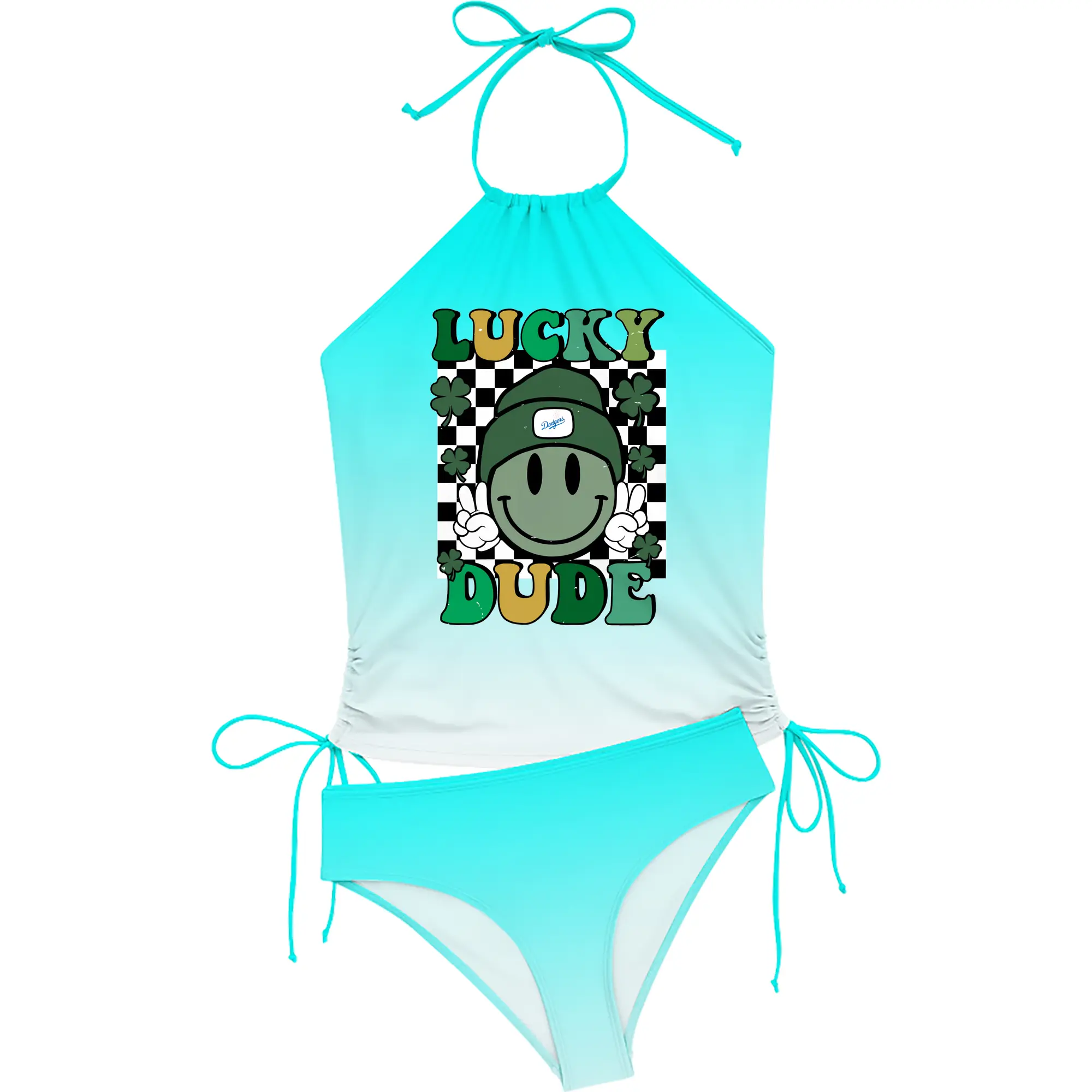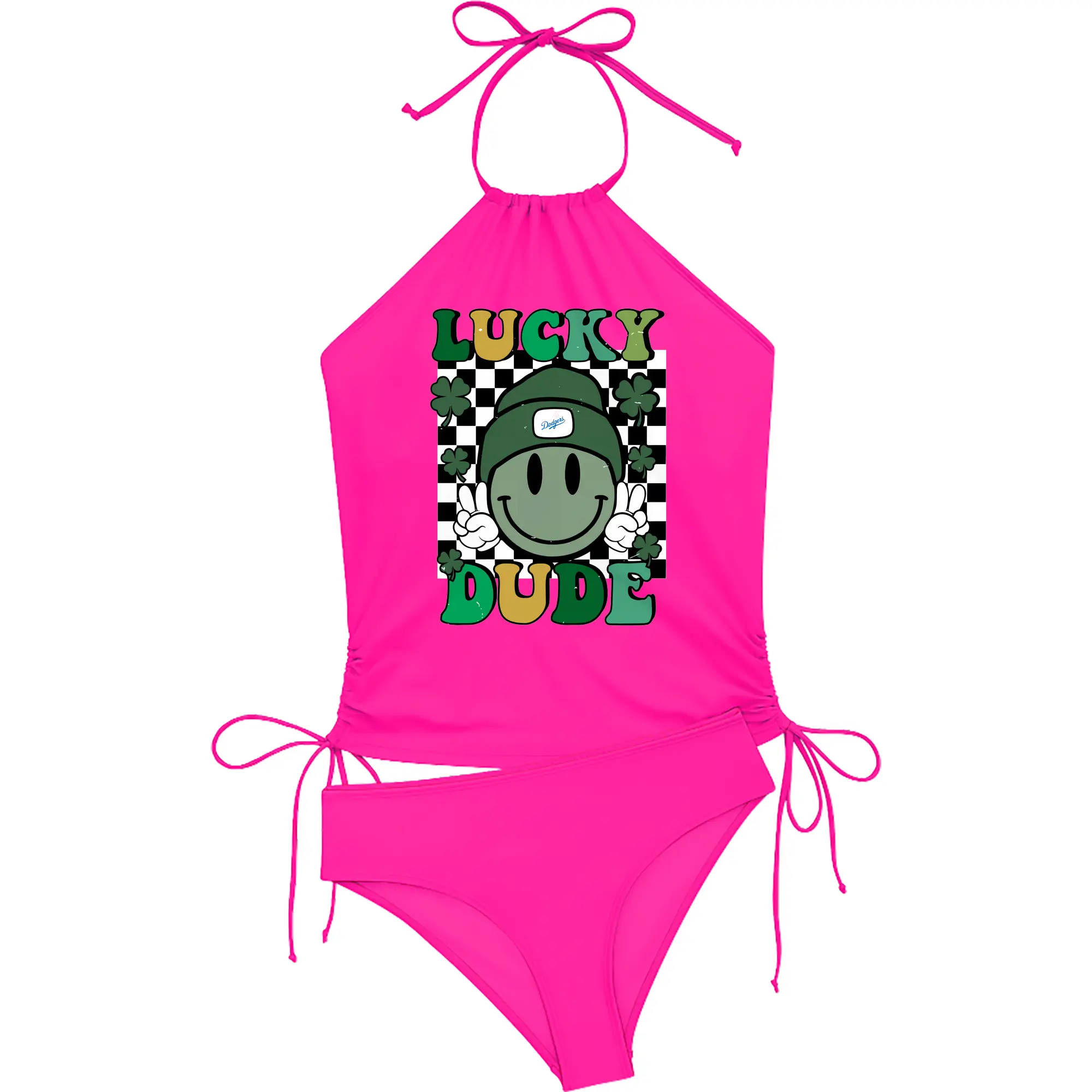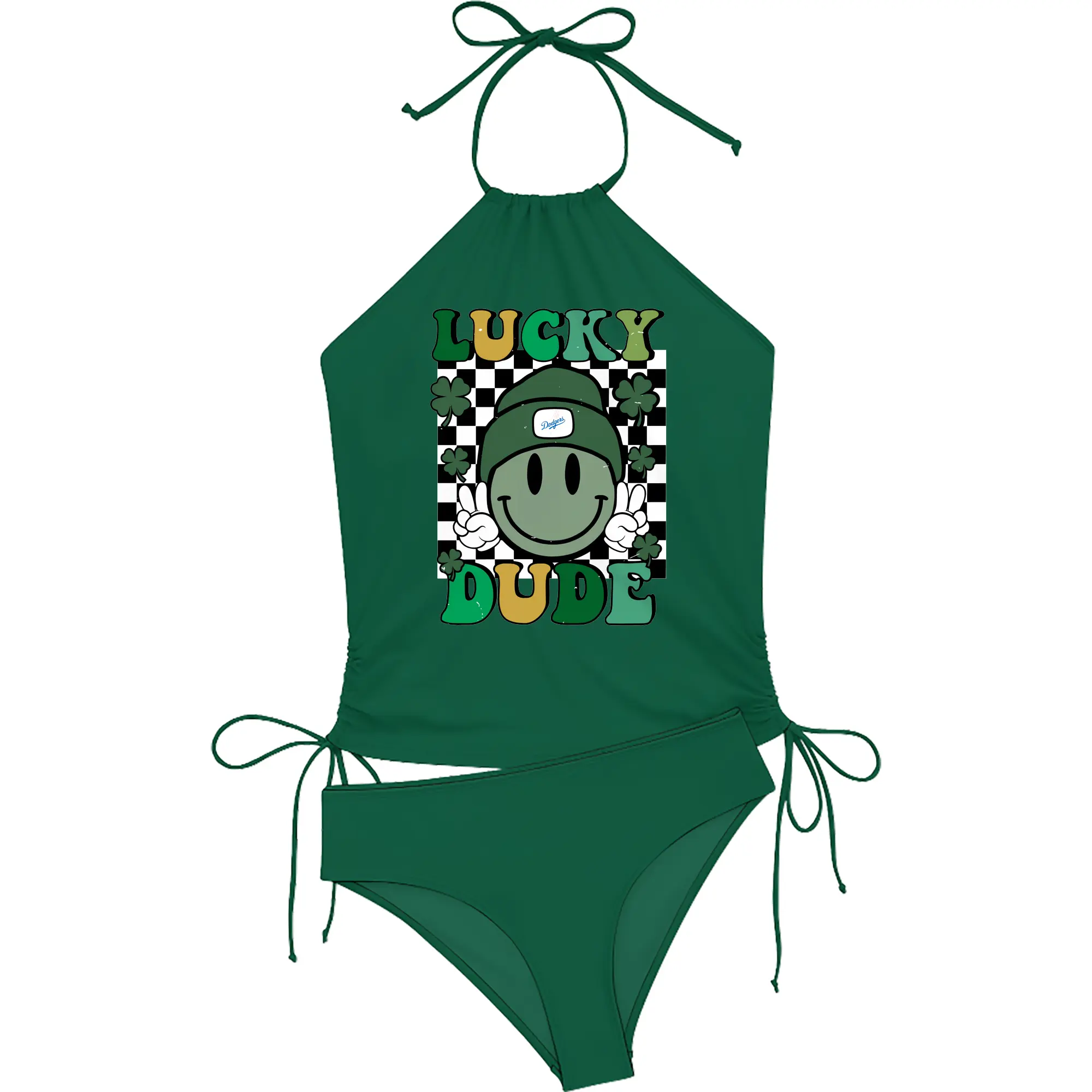 Happy Face Lucky Dude Los Angeles Dodgers - Women's Heat Transfer Printed Two-Piece Bikini Set – Sexy One-Shoulder Top & Triangle Bottom, Soft Nylon-Spandex – Perfect for Beach, Pool & Vacation
