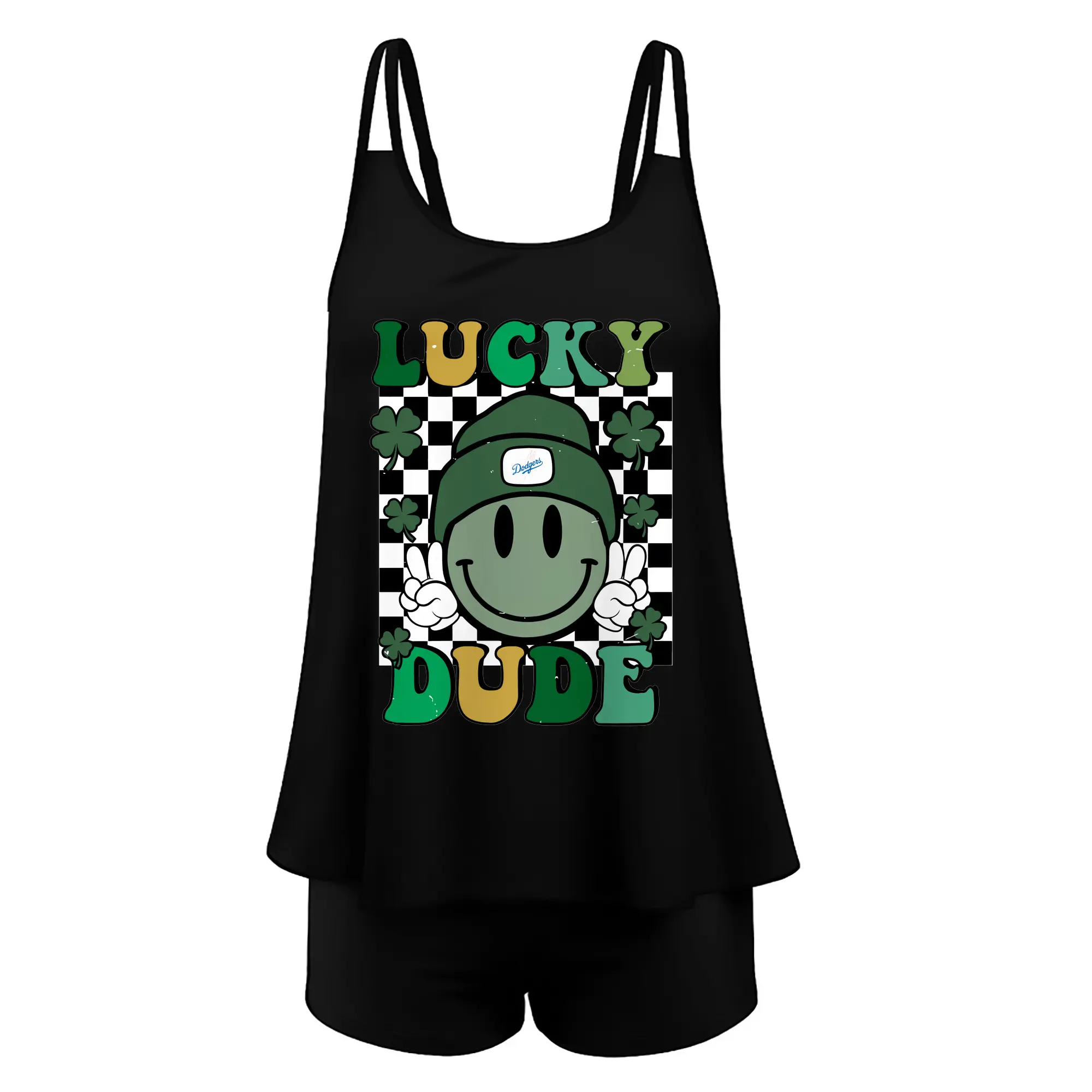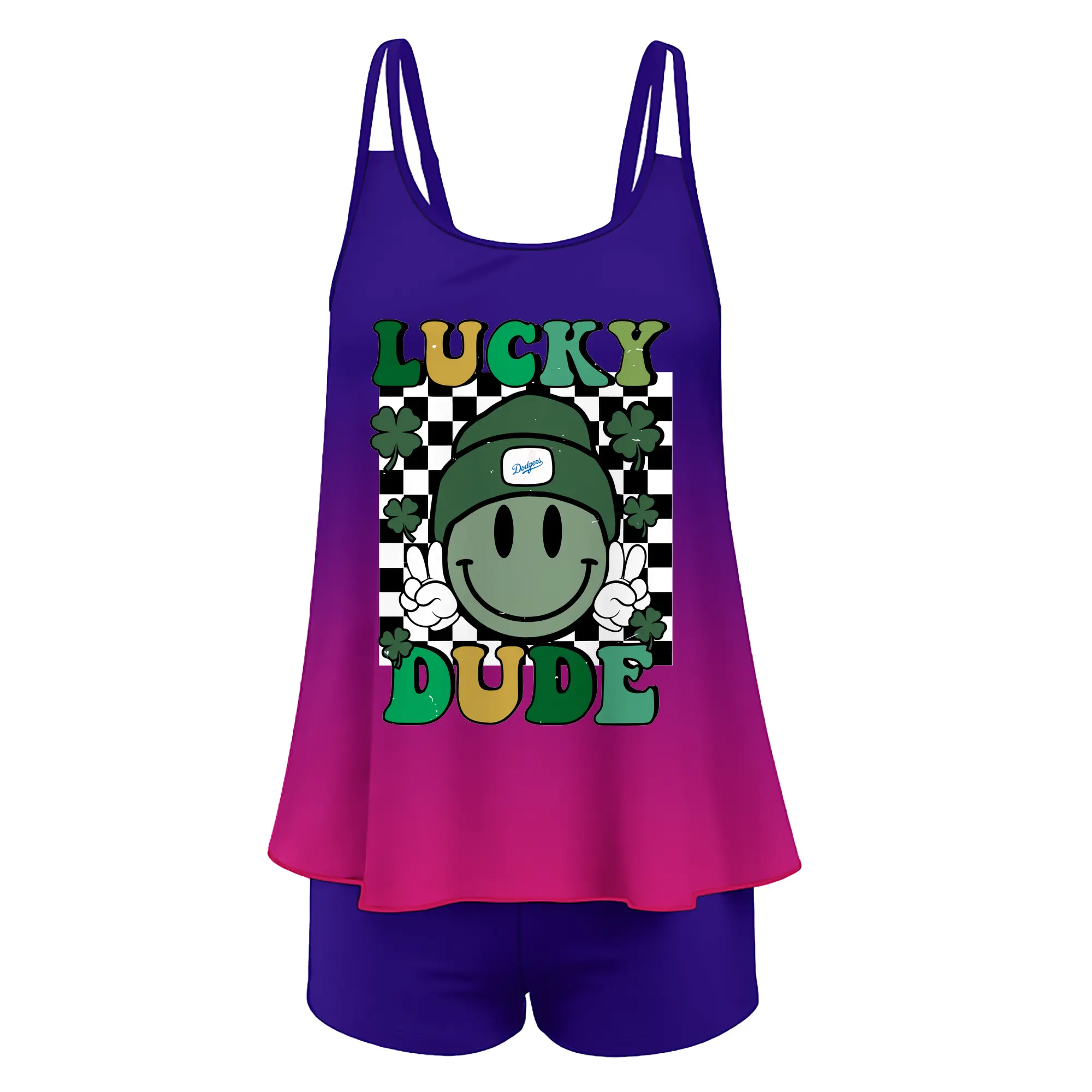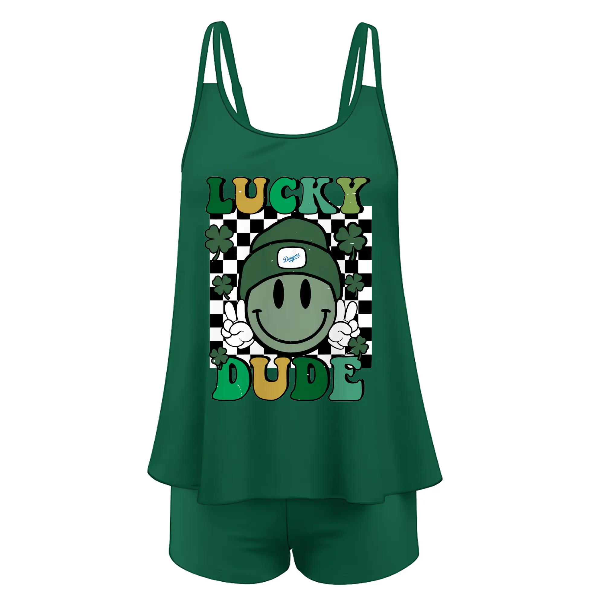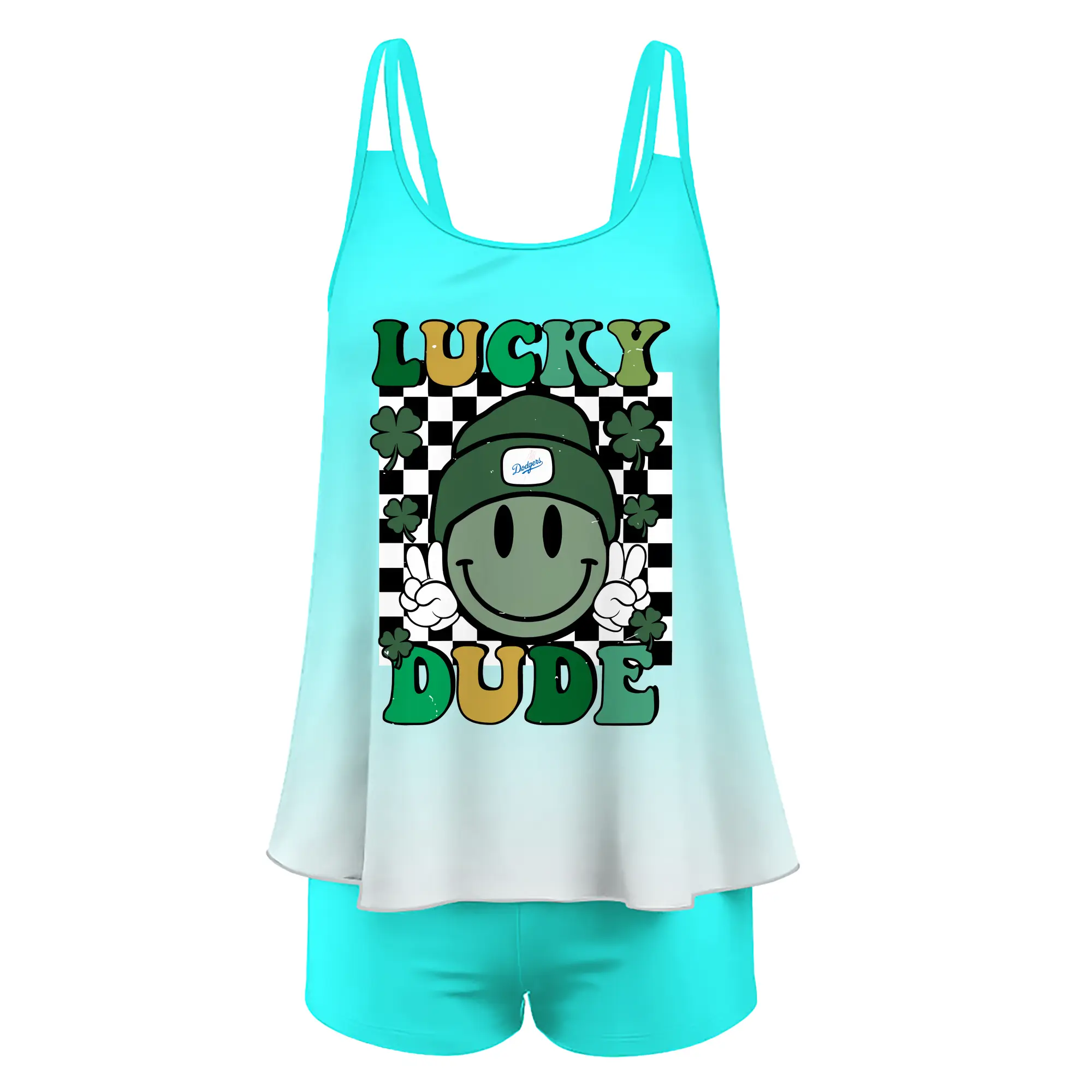 Happy Face Lucky Dude Los Angeles Dodgers - Women’s Heat Transfer Printed Two-Piece Swimsuit Set – Sexy Double Strap Bandeau Top & Boyshort Bottoms, Soft Nylon-Spandex – Perfect for Beach, Pool & Vacation