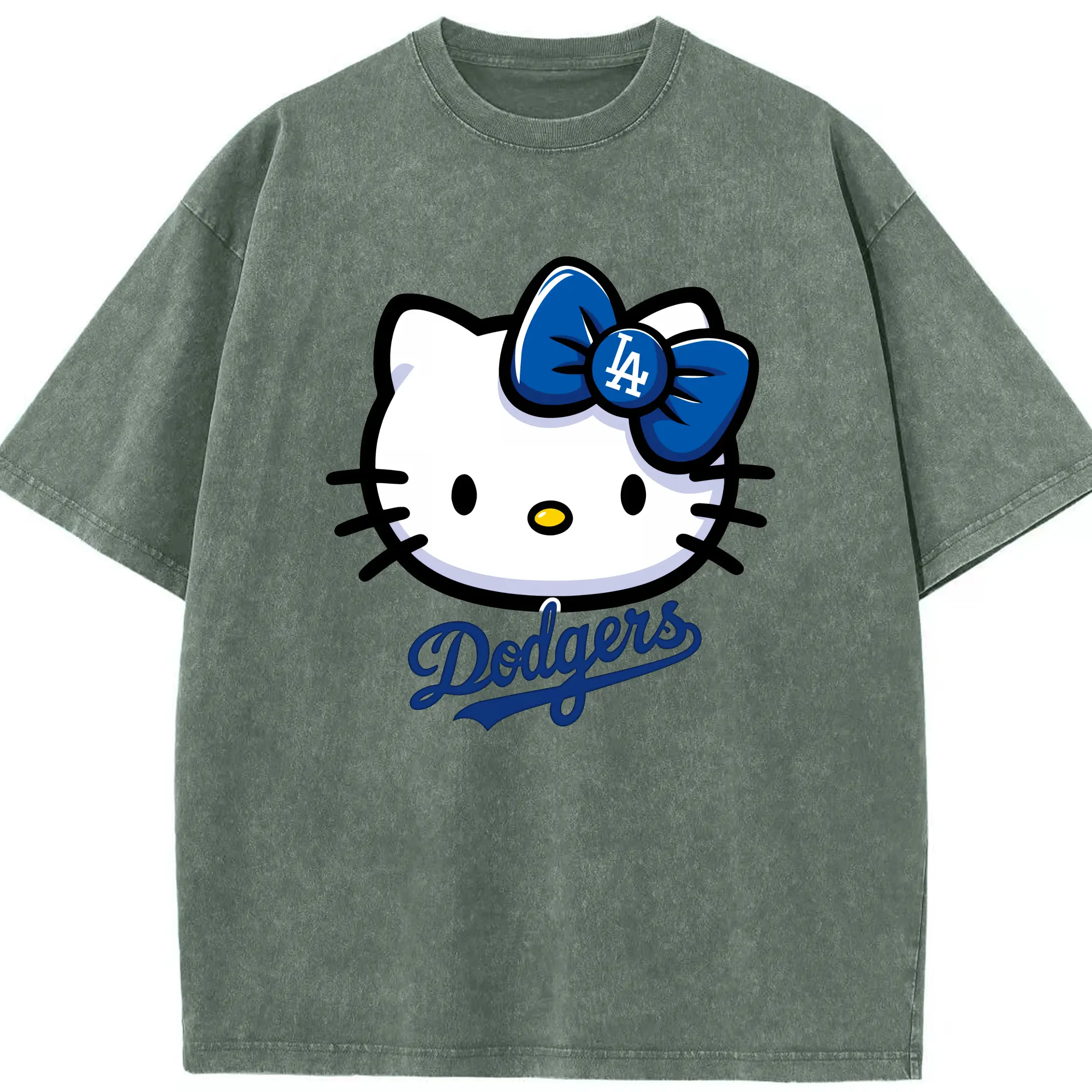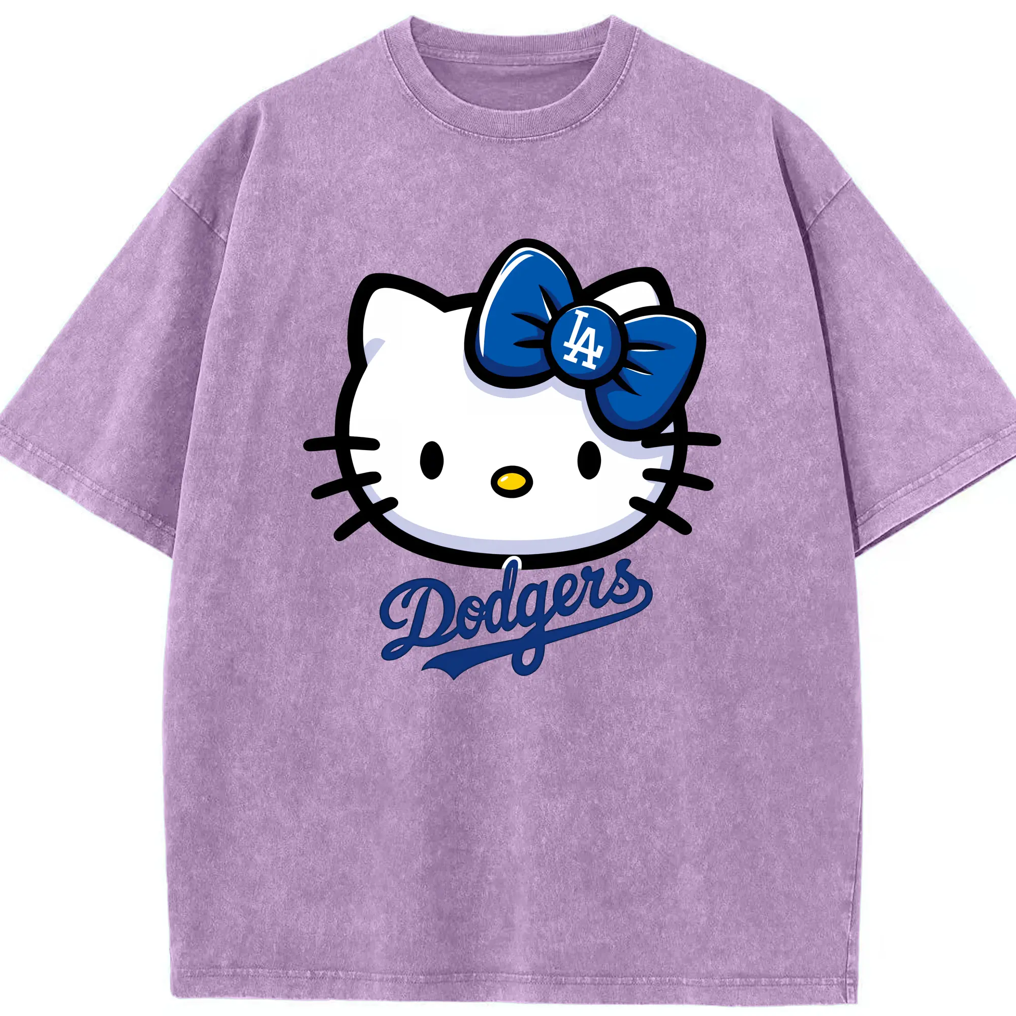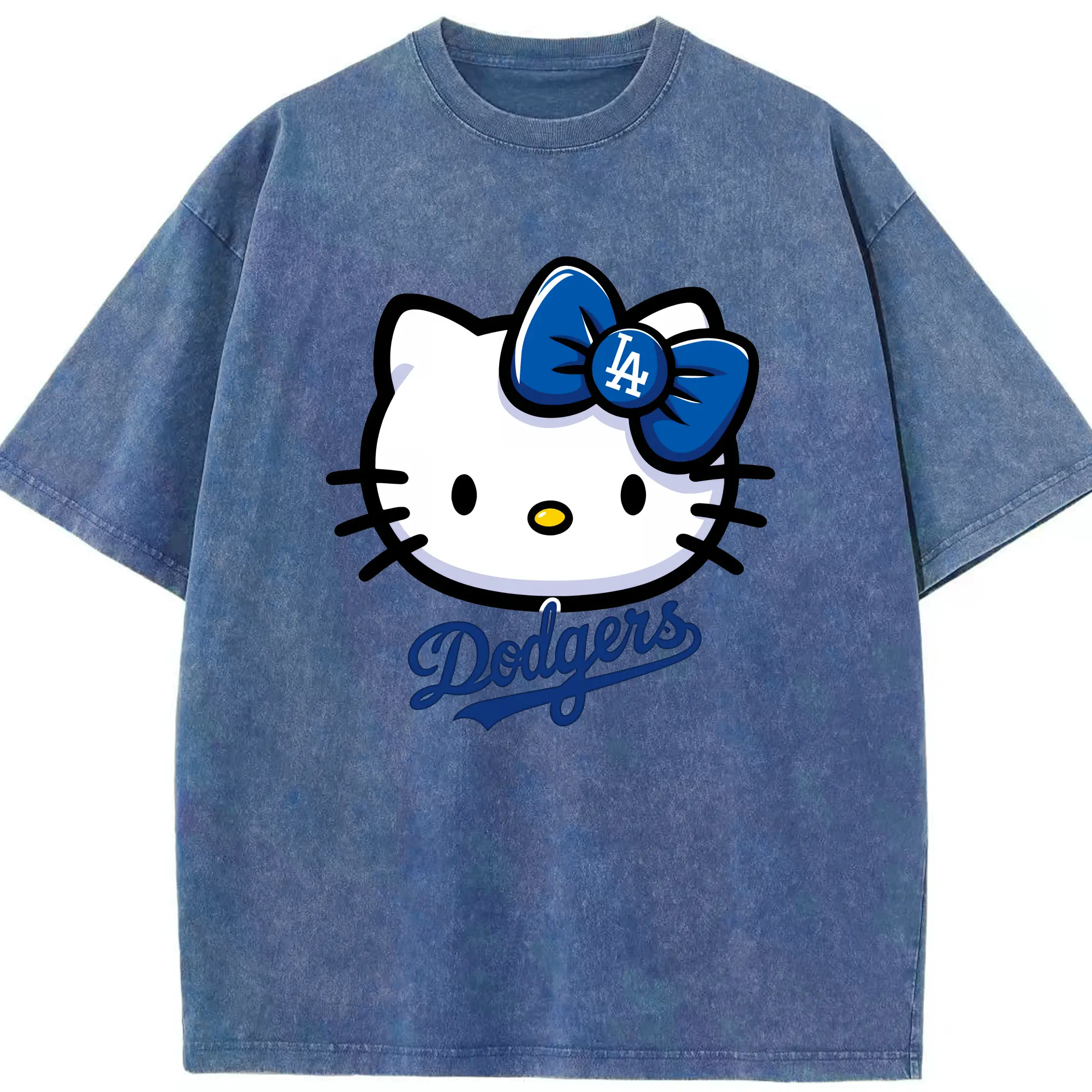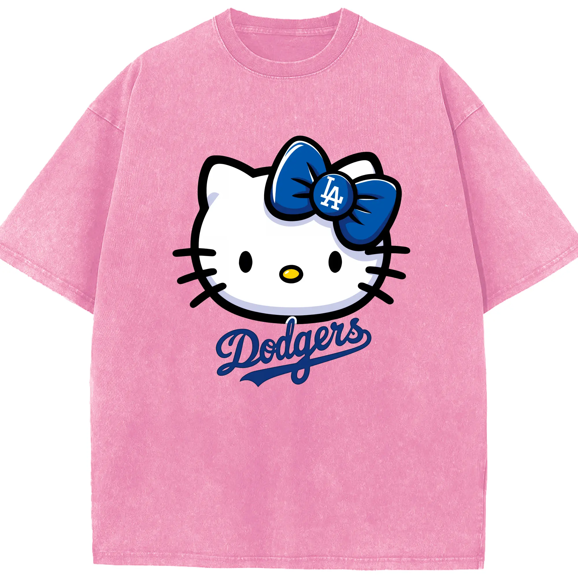 Hello Kitty Baseball LA Dodgers - Washed Vintage Look 230g Cotton Oversized T-Shirt With Front Heat Transfer Print – Soft, Lightweight, Stylish Fit – Comfortable Casual Wear For Sports & Everyday Use
