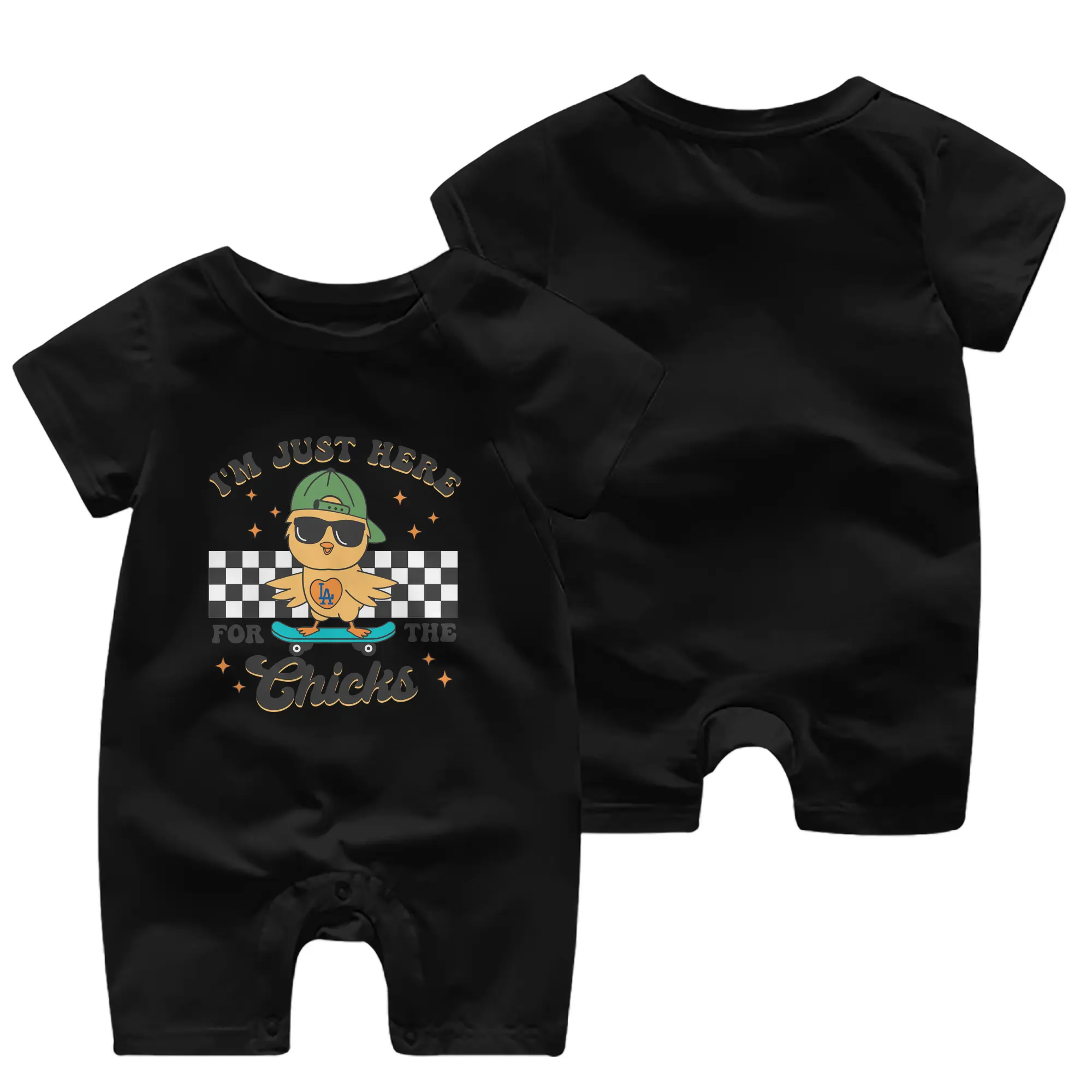 Im Just Here For The Chicks Los Angeles Dodgers - Baby Short Sleeve Onesie – 100% Cotton Soft & Breathable Digital Print Romper – Double-Sided Print, Snap Closure For Easy Diaper Changes – Comfortable For Boys & Girls