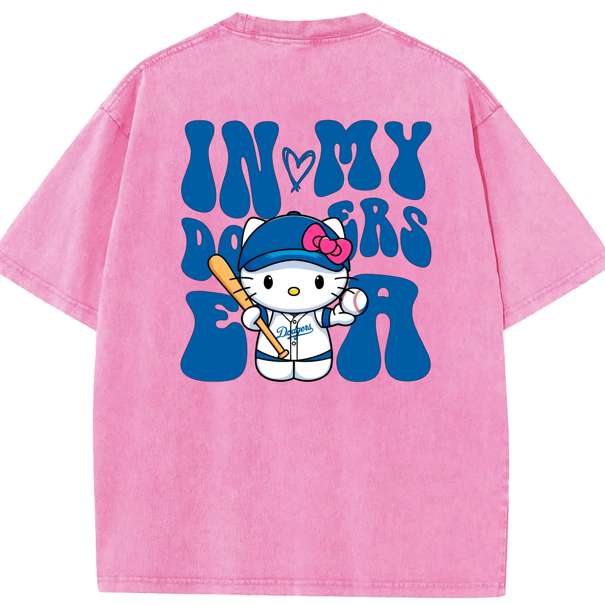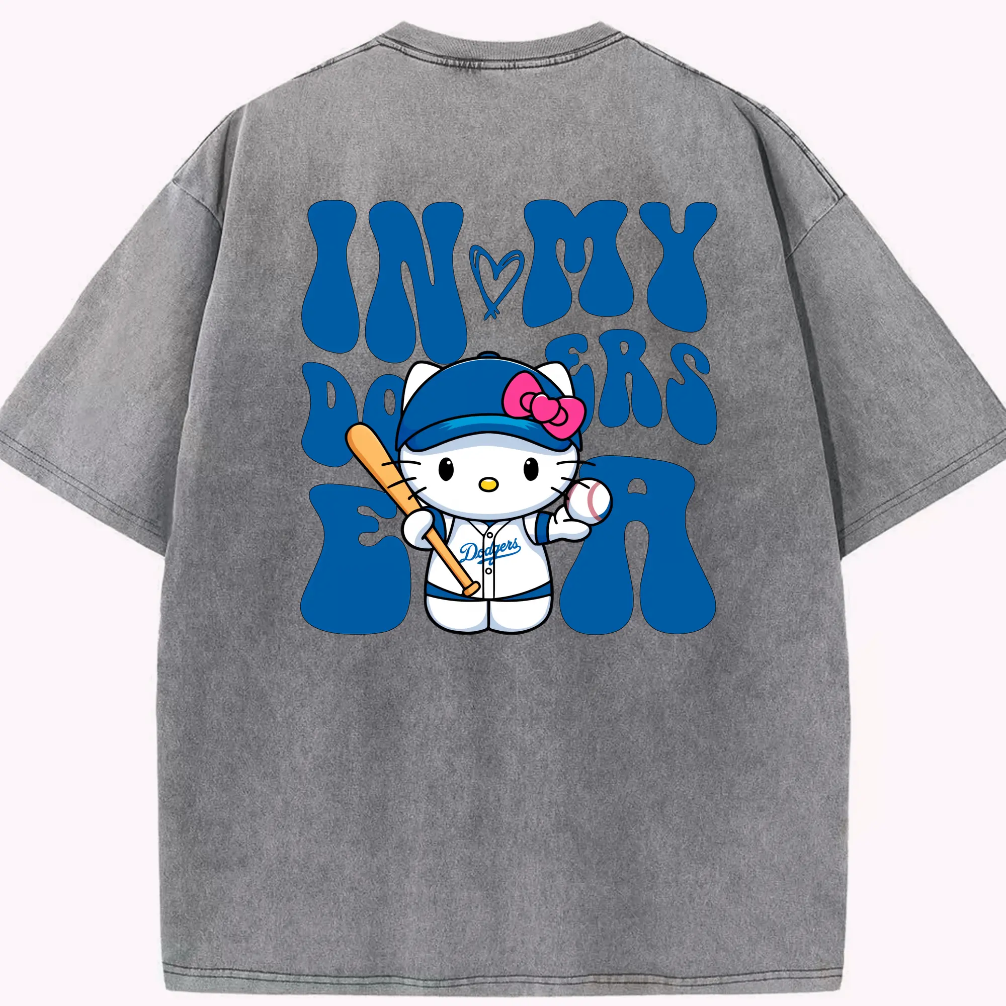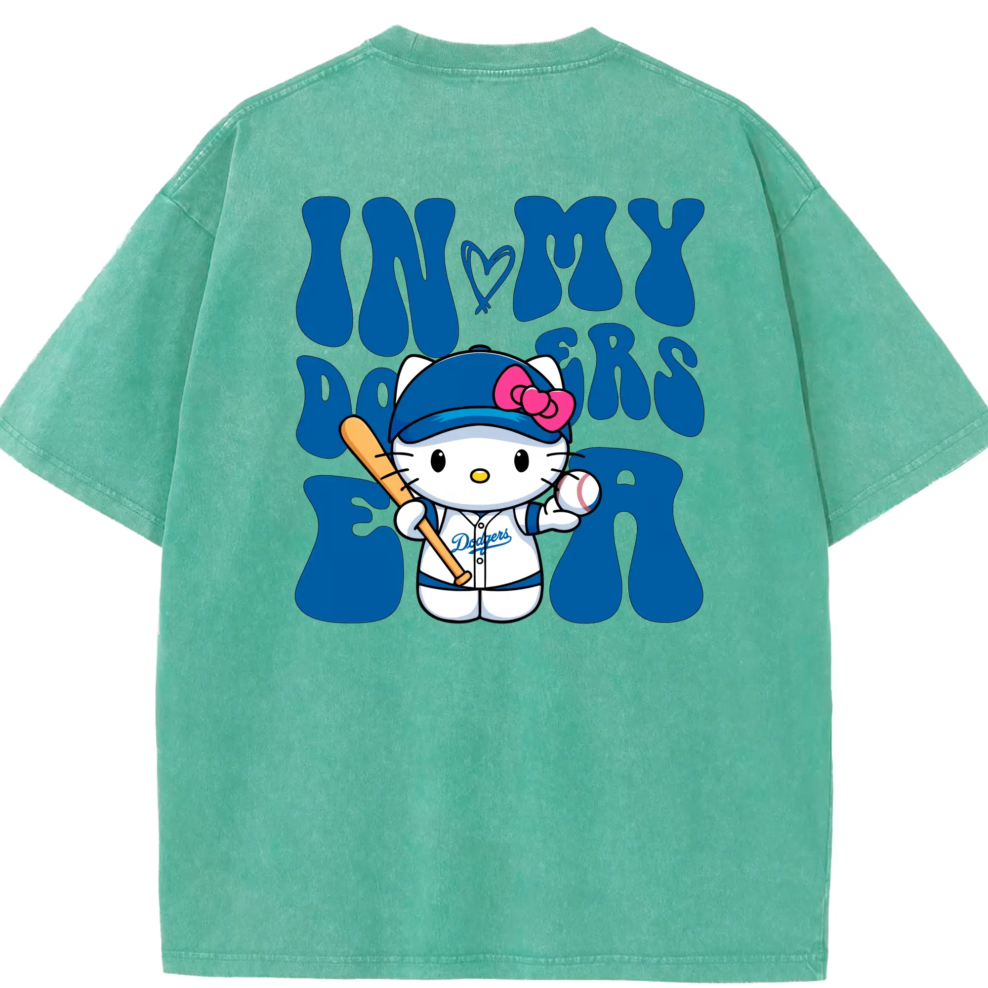 In My Dodgers Era Hello Kitty Baseball - Washed Vintage 230g Cotton Oversized T-Shirt With Back Heat Transfer Print – Soft, Lightweight & Stylish – Comfortable Casual Wear For Sports & Everyday Use