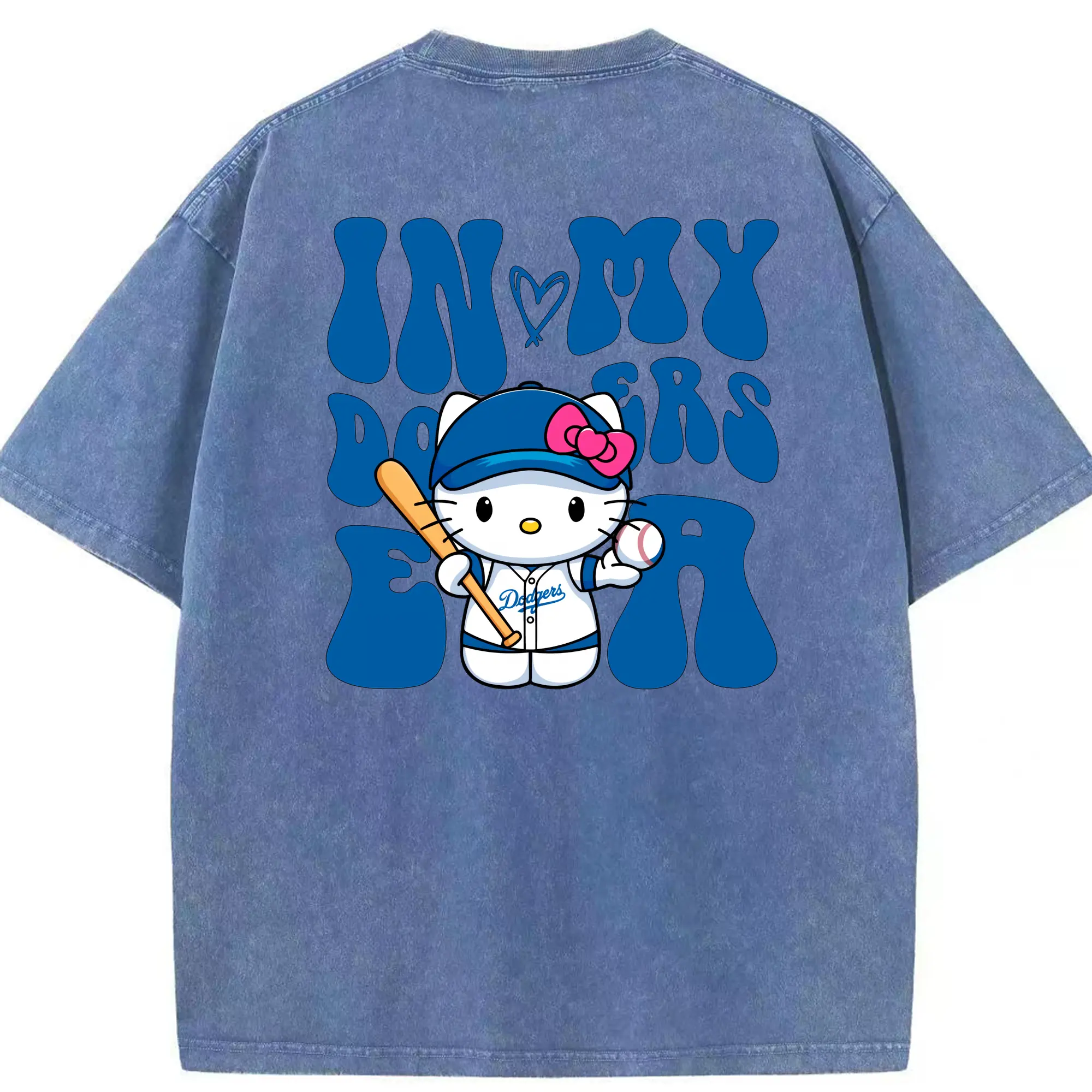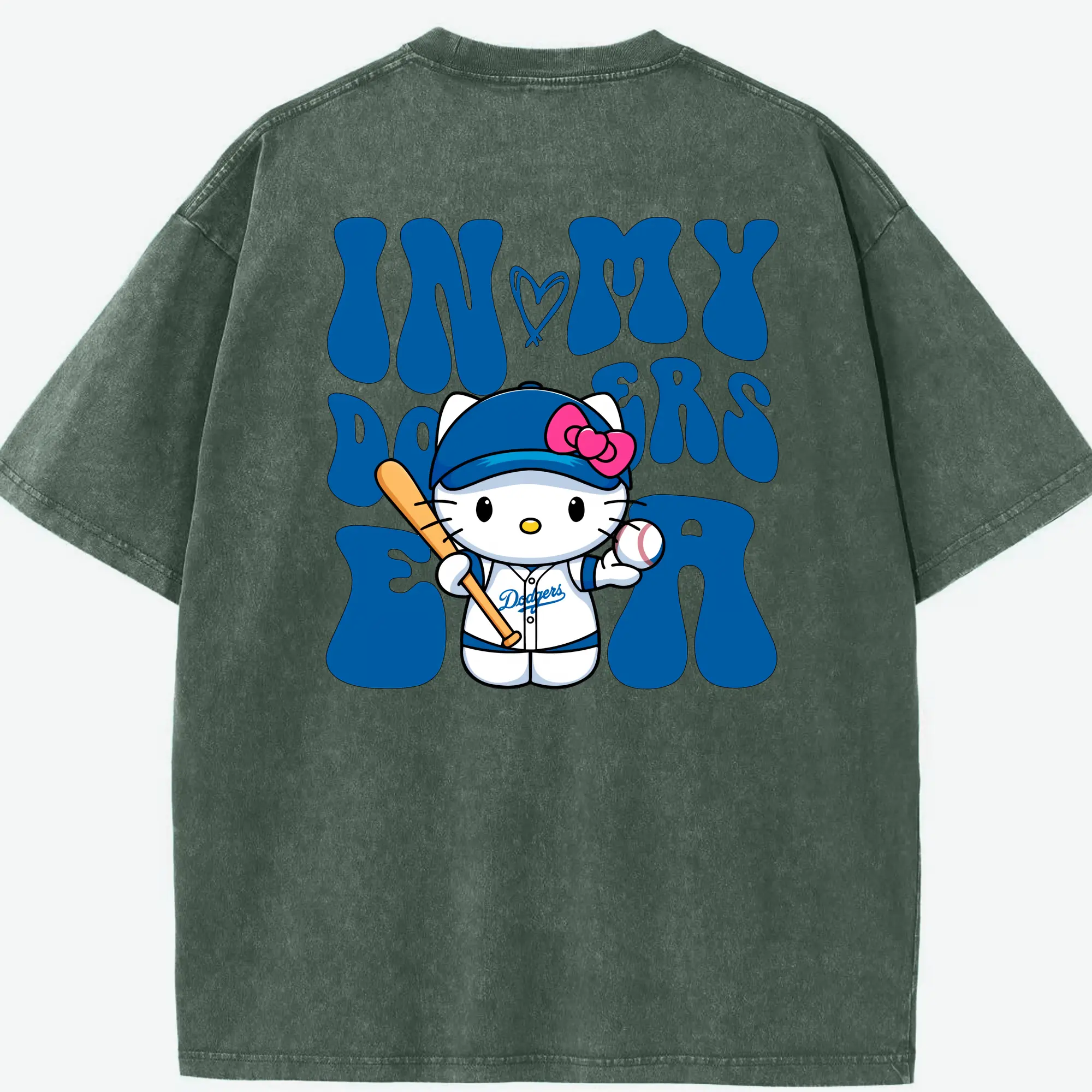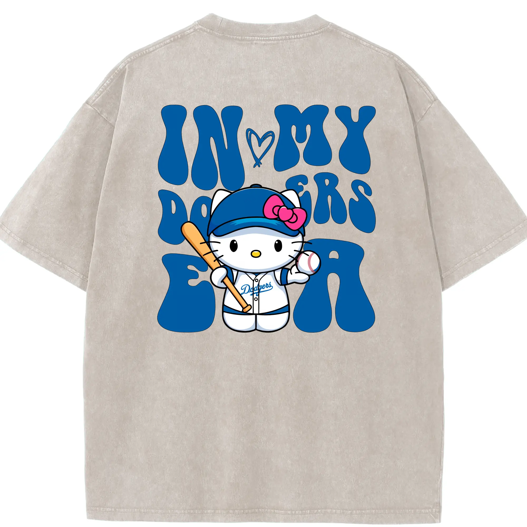 In My Dodgers Era Hello Kitty Baseball - Washed Vintage 230g Cotton Oversized T-Shirt With Back Heat Transfer Print – Soft, Lightweight & Stylish – Comfortable Casual Wear For Sports & Everyday Use