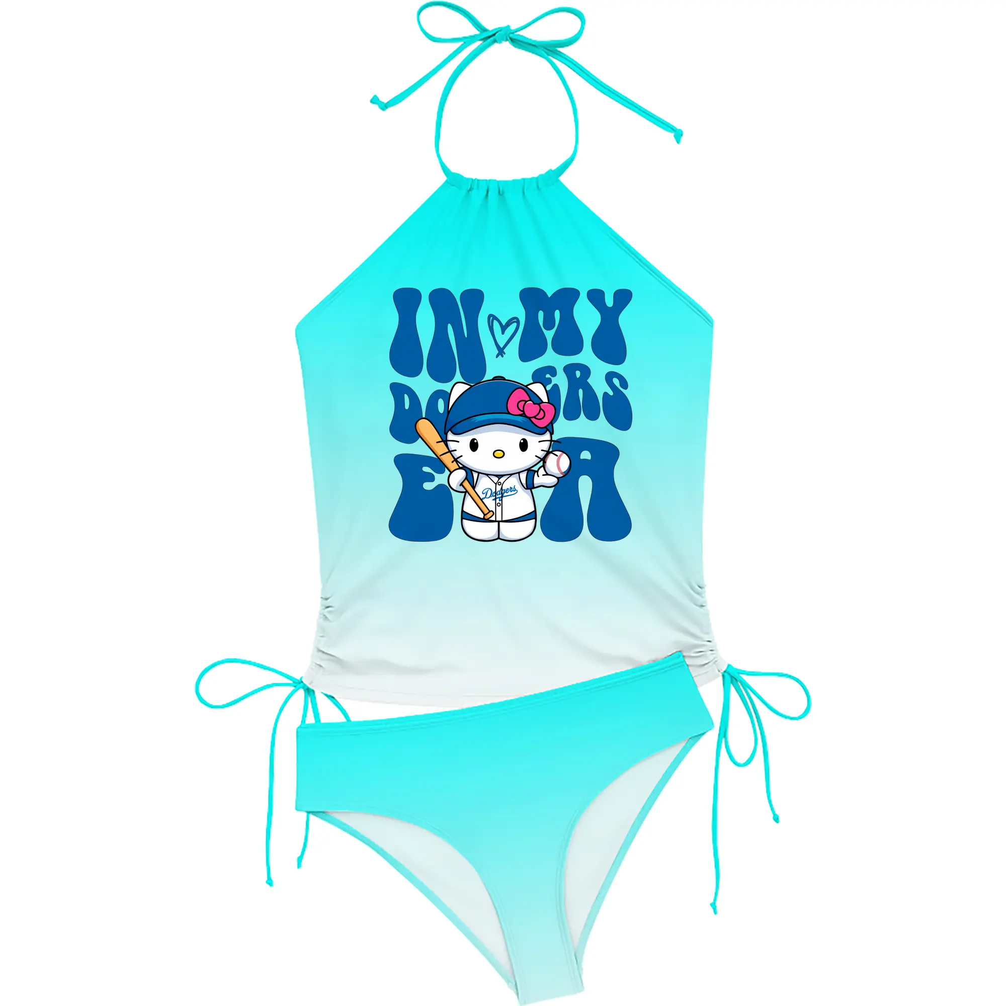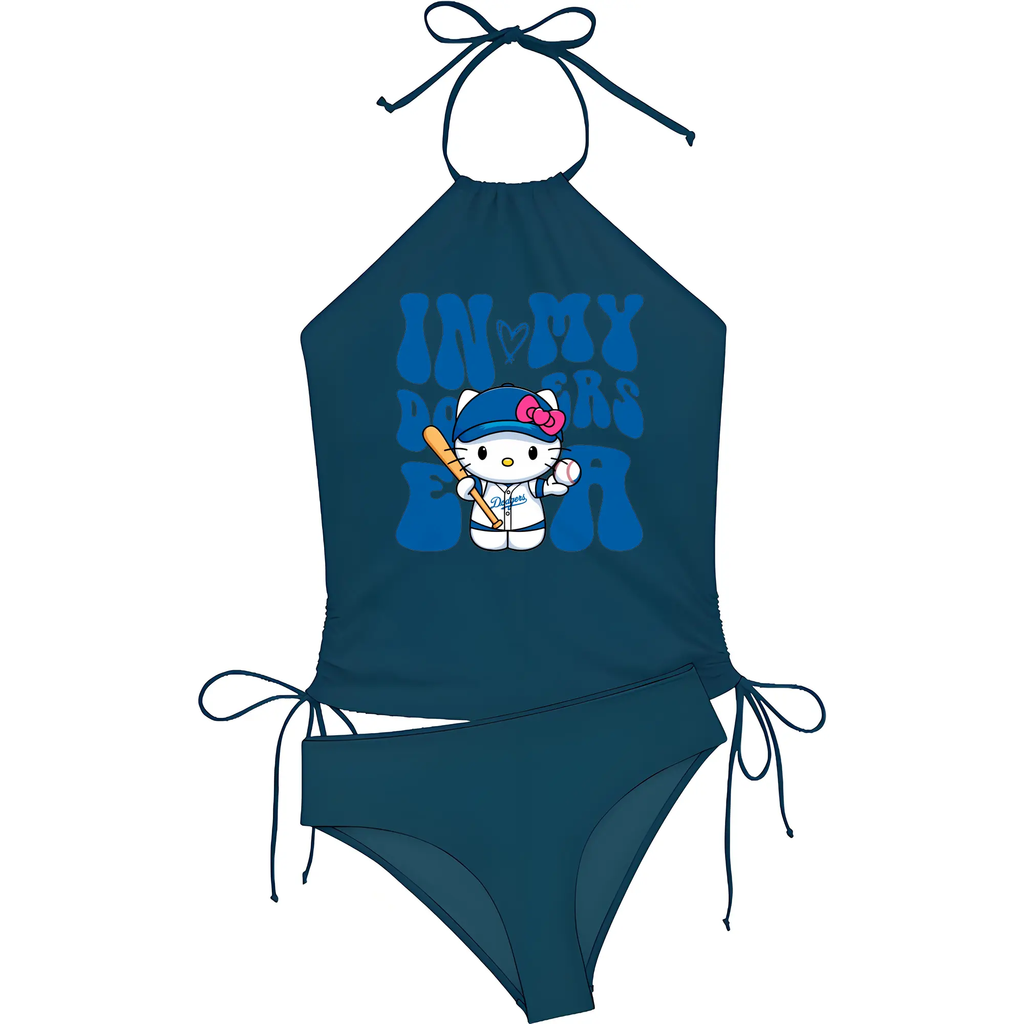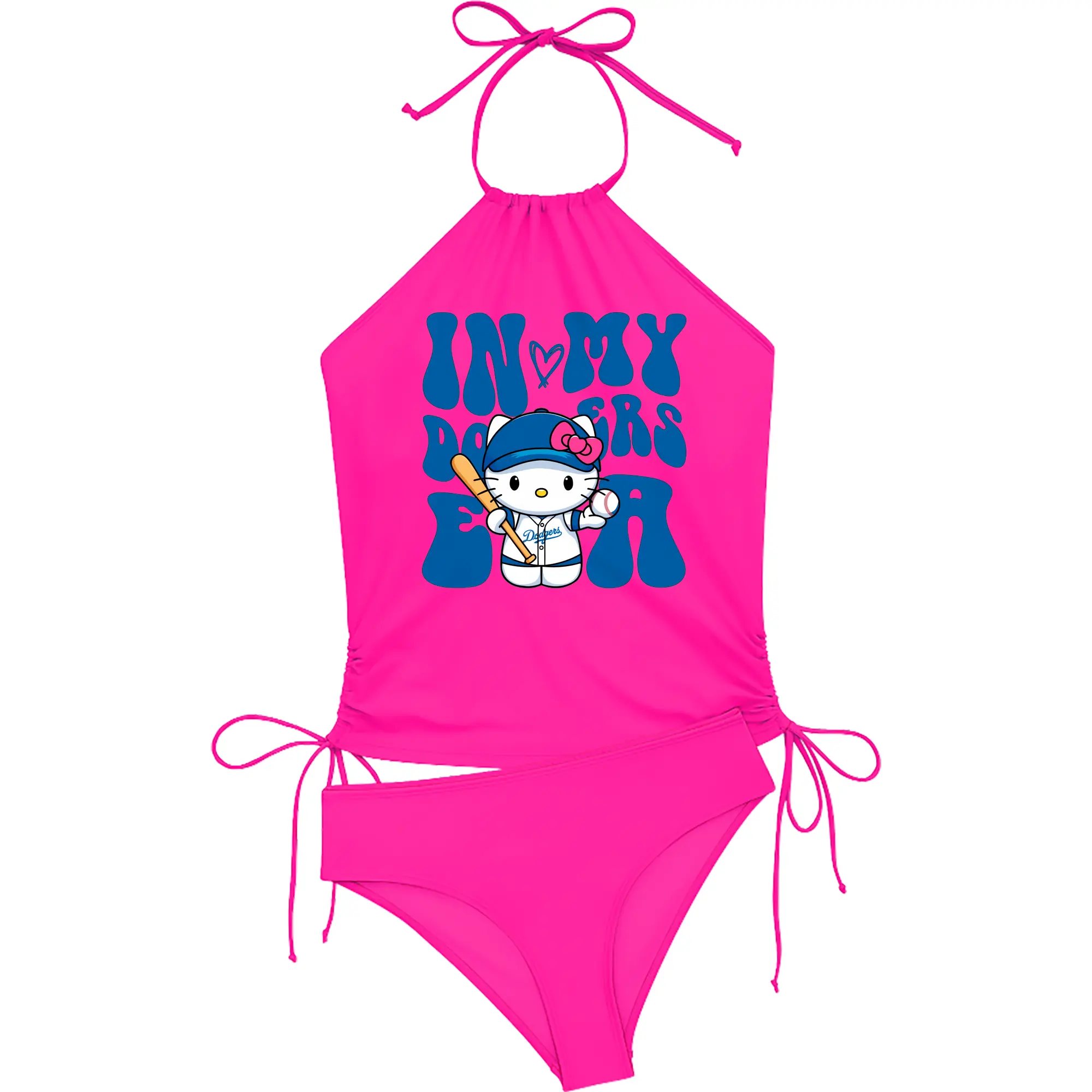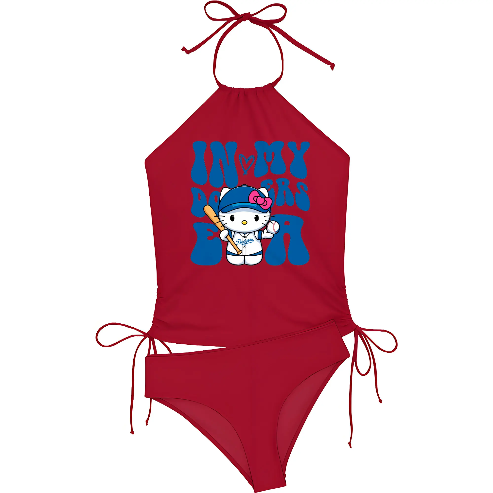 In My Dodgers Era Hello Kitty Baseball - Women's Heat Transfer Printed Two-Piece Bikini Set – Sexy One-Shoulder Top & Triangle Bottom, Soft Nylon-Spandex – Perfect for Beach, Pool & Vacation