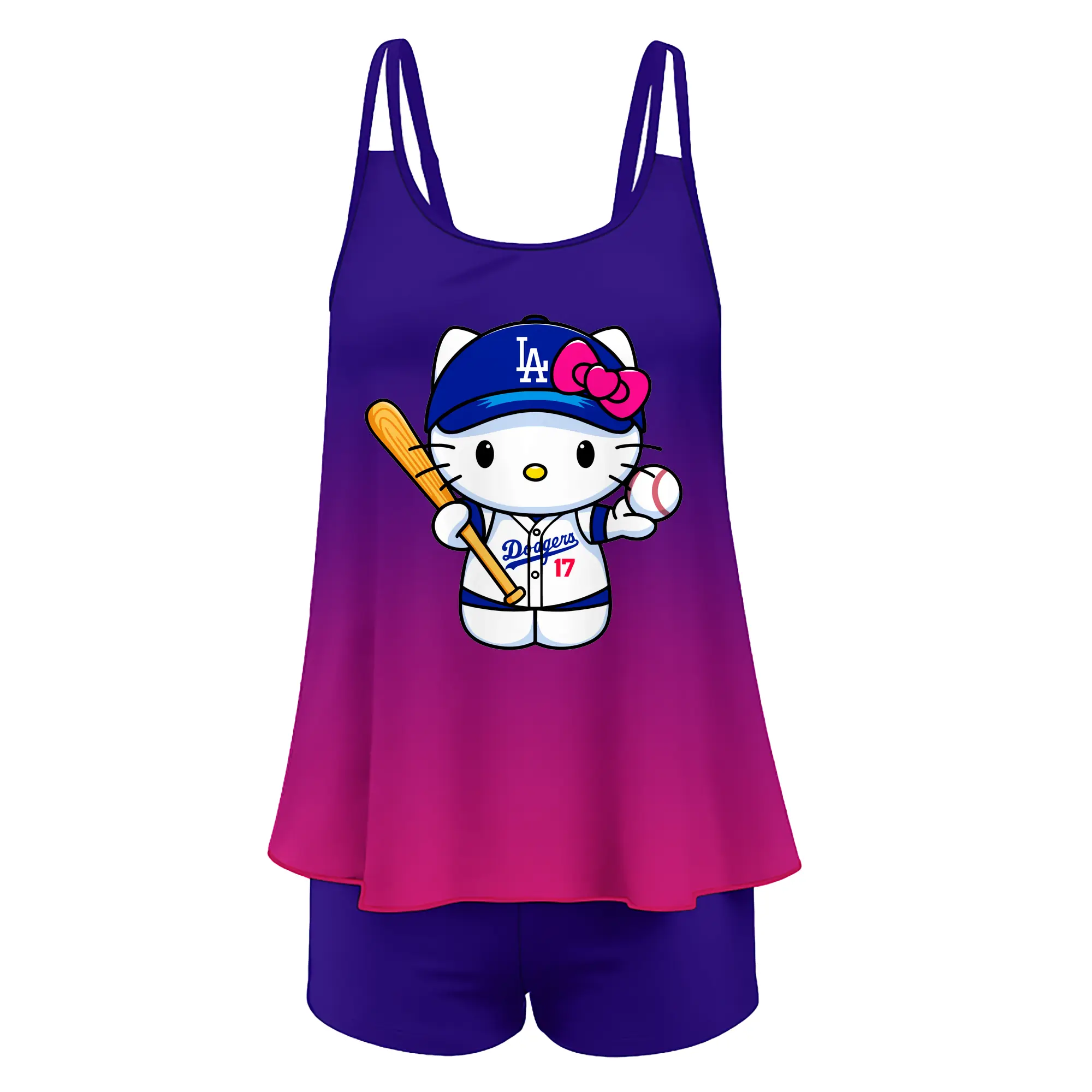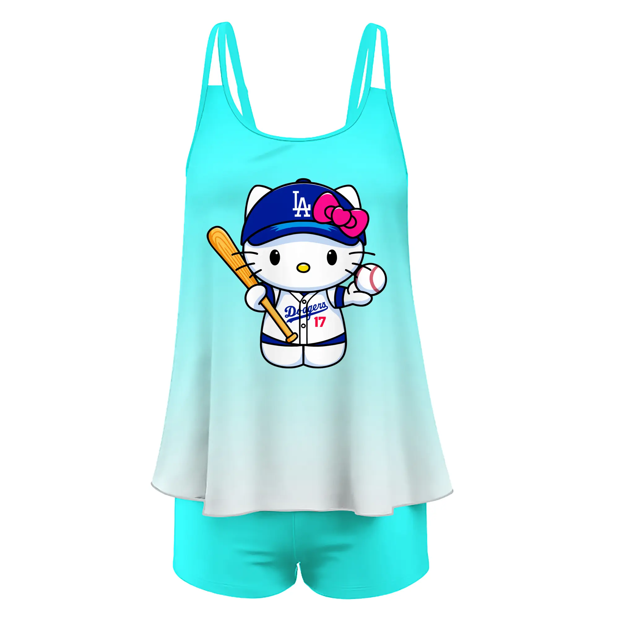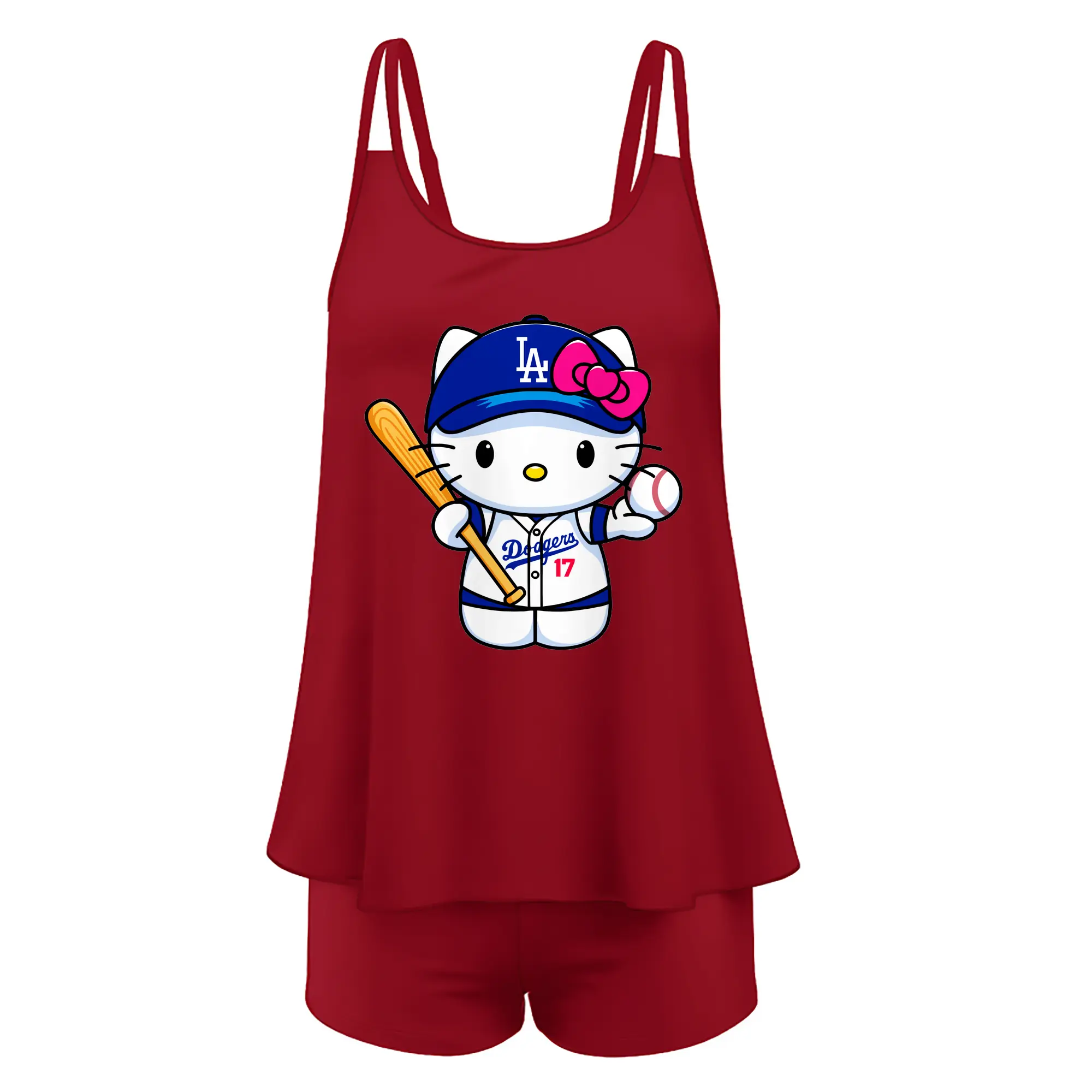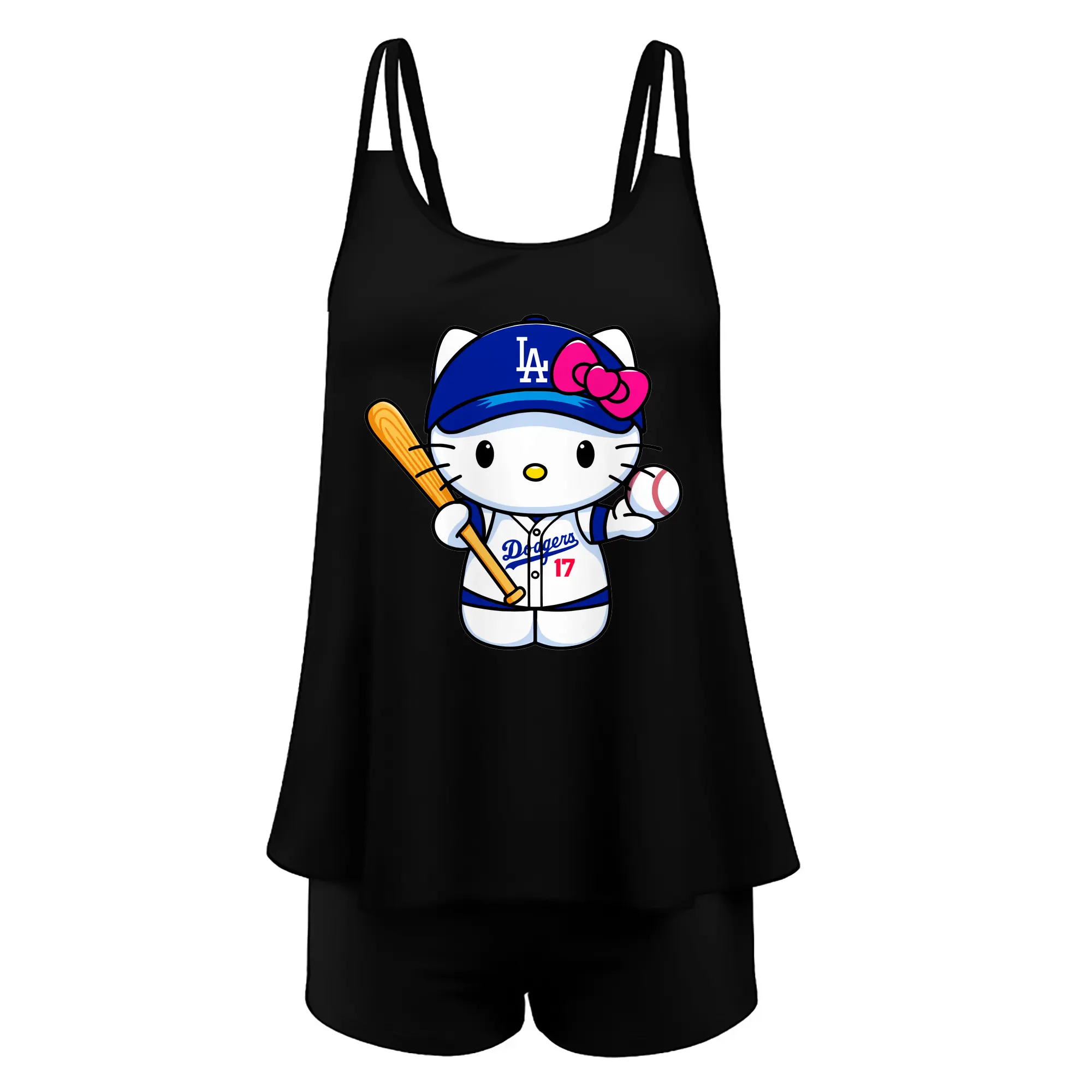 LA Dodgers Hello Kitty MLB Team - Women’s Heat Transfer Printed Two-Piece Swimsuit Set – Sexy Double Strap Bandeau Top & Boyshort Bottoms, Soft Nylon-Spandex – Perfect for Beach, Pool & Vacation