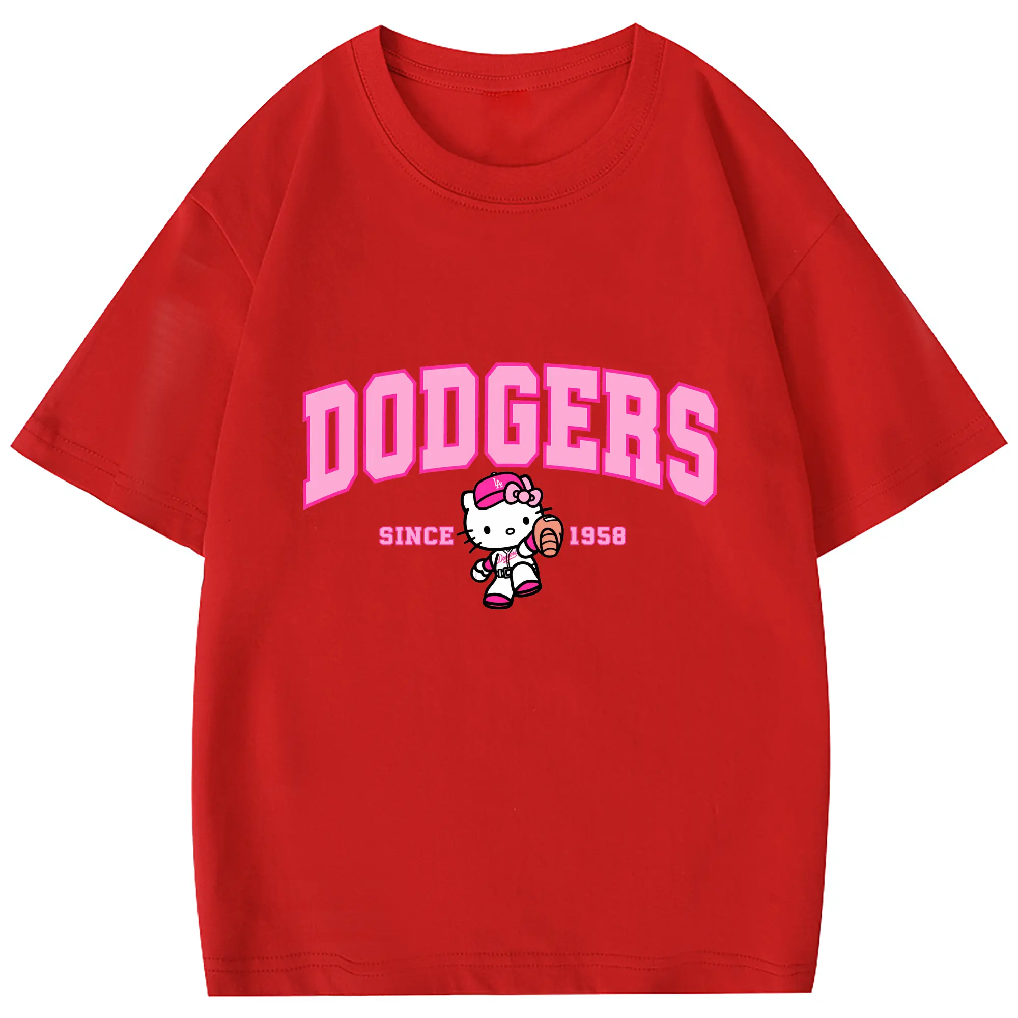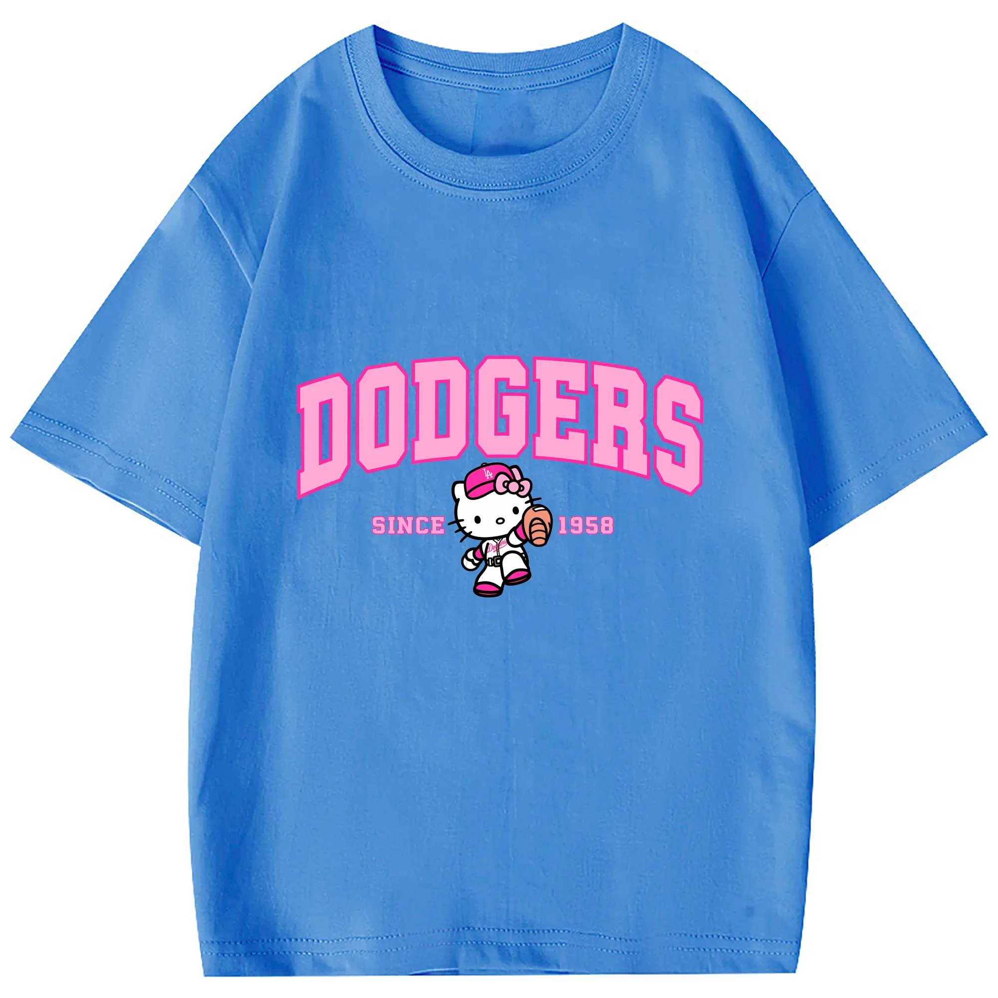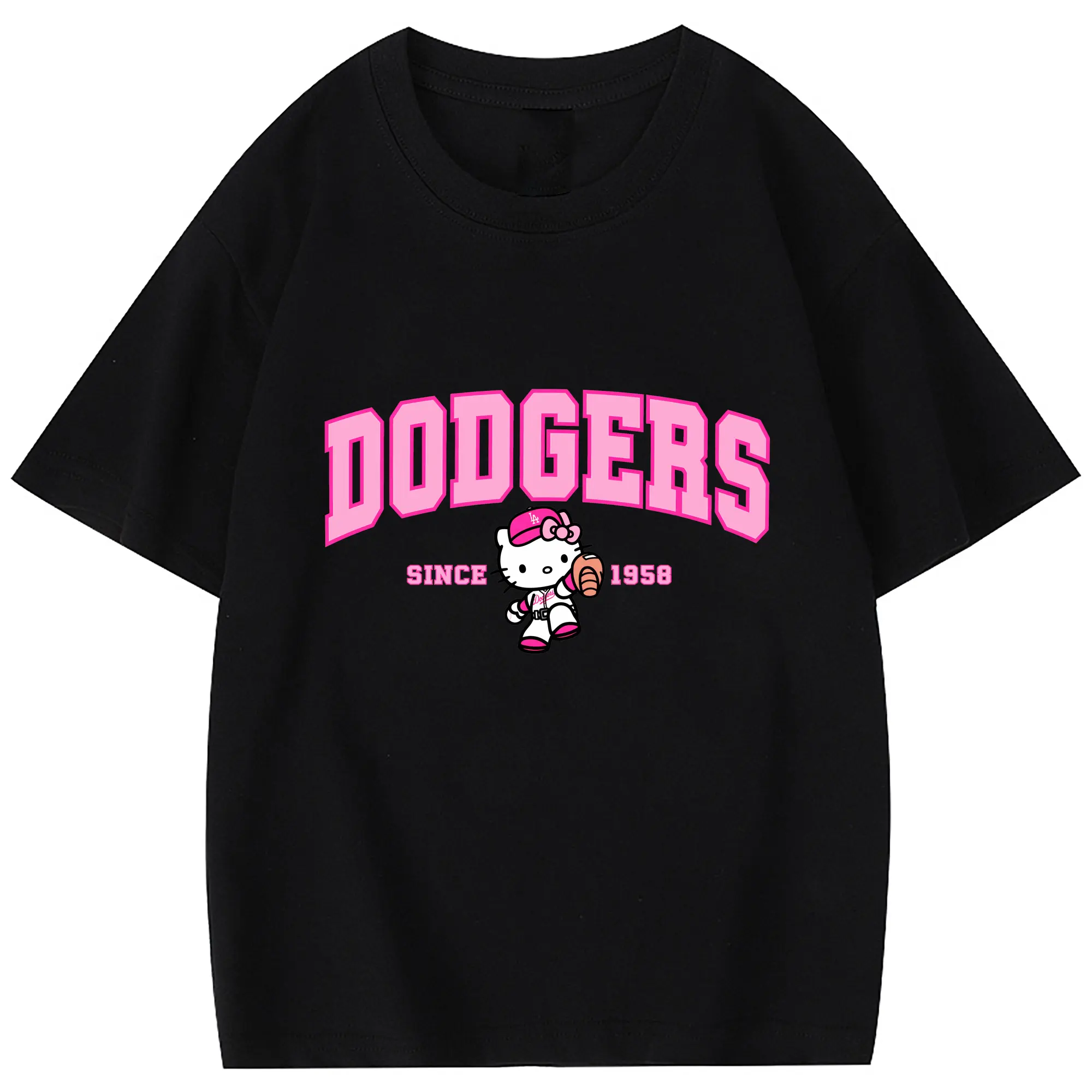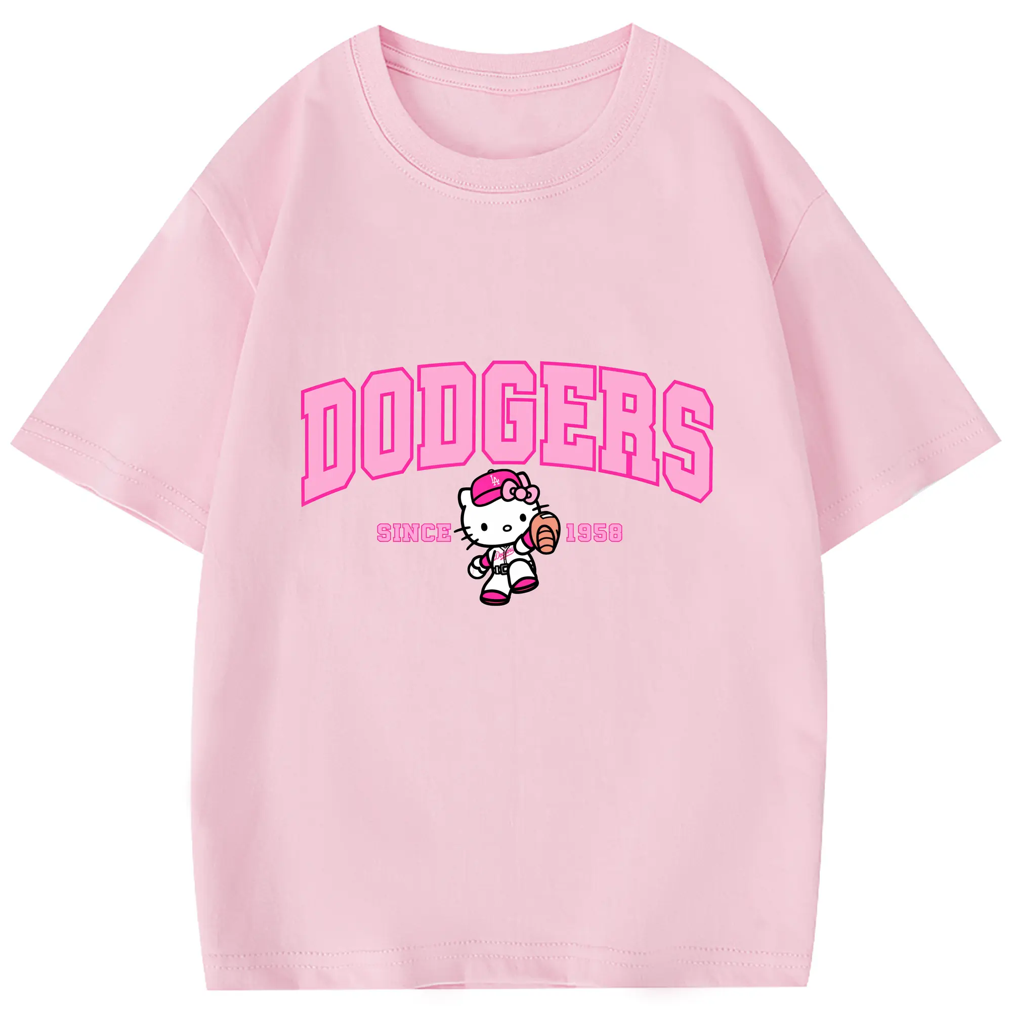 Pink Baseball Hello Kitty Dodgers - Combed Cotton Kids T-Shirt 180g With Front Heat Transfer Print – Soft, Lightweight, Side-Seamed Design – Stylish And Comfortable Casual Wear For Everyday Activities