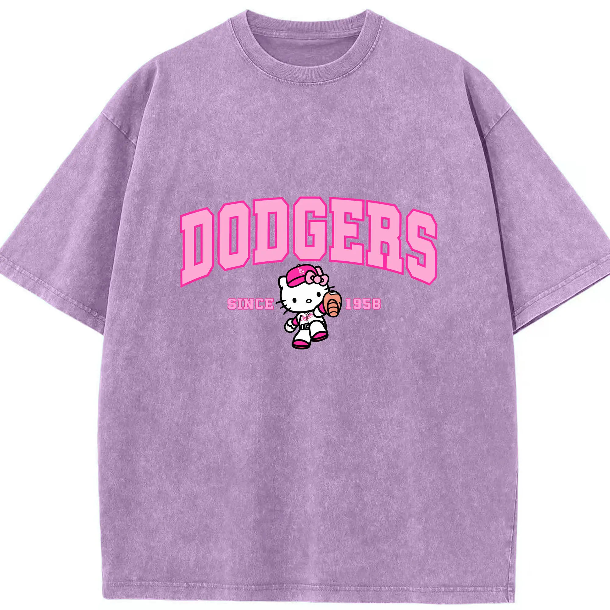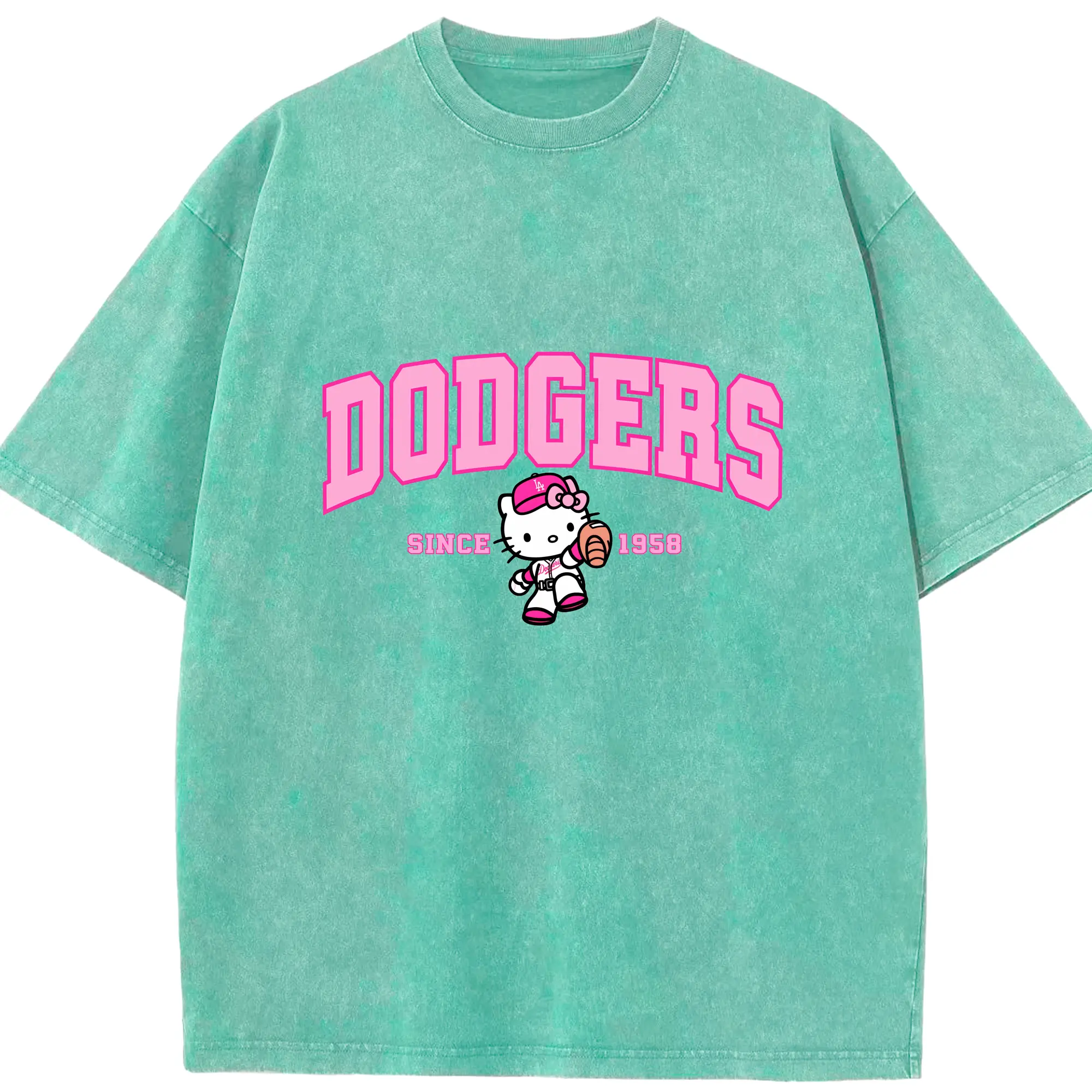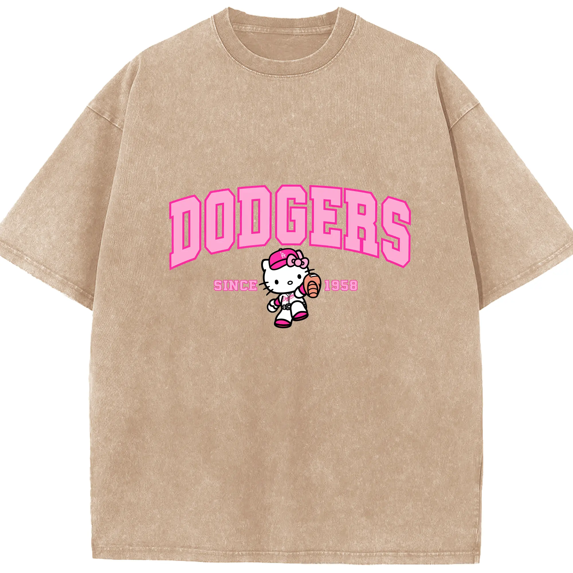 Pink Baseball Hello Kitty Dodgers - Washed Vintage Look 230g Cotton Oversized T-Shirt With Front Heat Transfer Print – Soft, Lightweight, Stylish Fit – Comfortable Casual Wear For Sports & Everyday Use