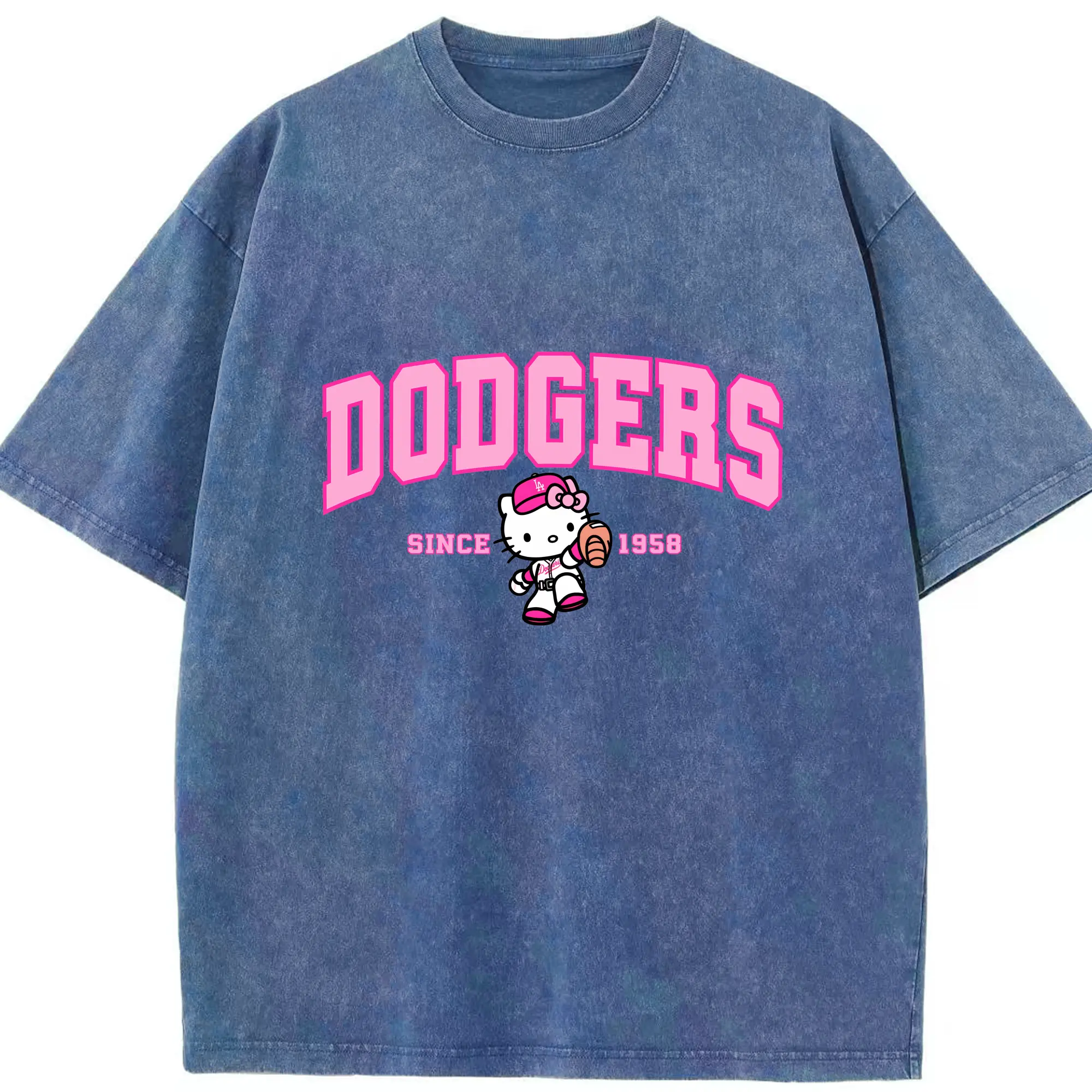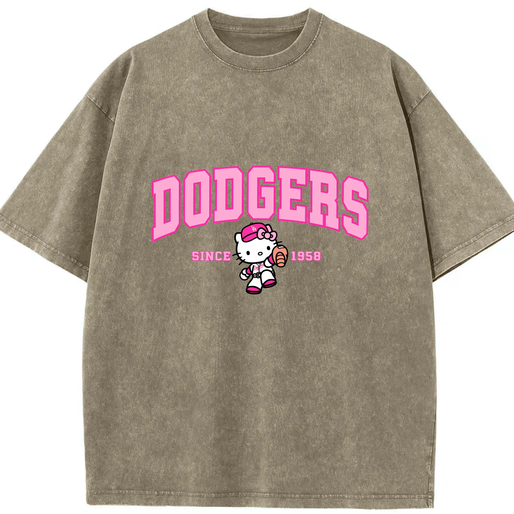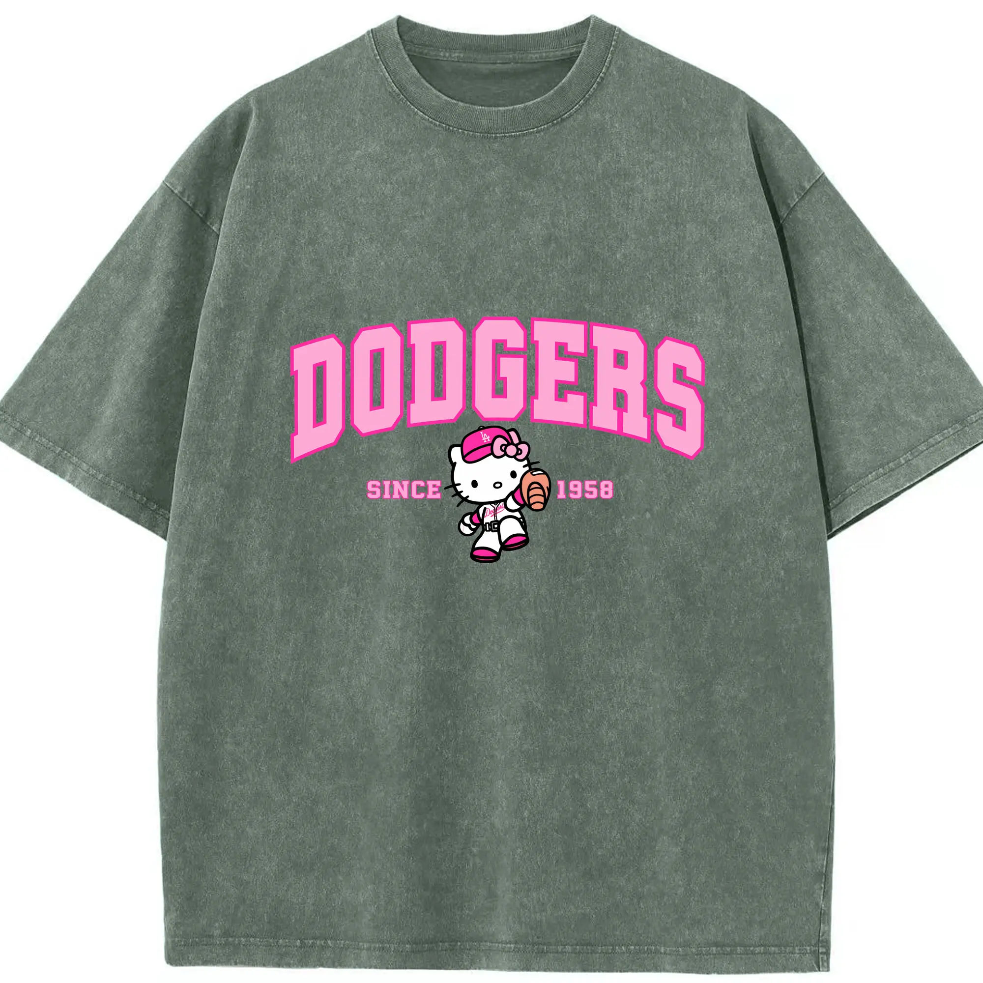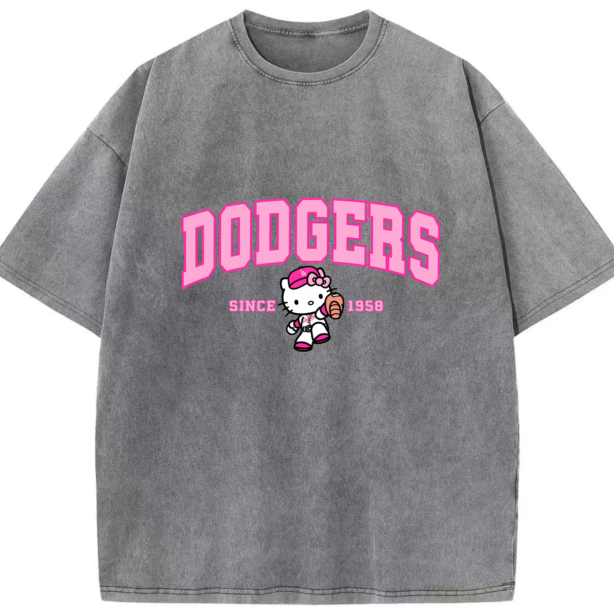 Pink Baseball Hello Kitty Dodgers - Washed Vintage Look 230g Cotton Oversized T-Shirt With Front Heat Transfer Print – Soft, Lightweight, Stylish Fit – Comfortable Casual Wear For Sports & Everyday Use