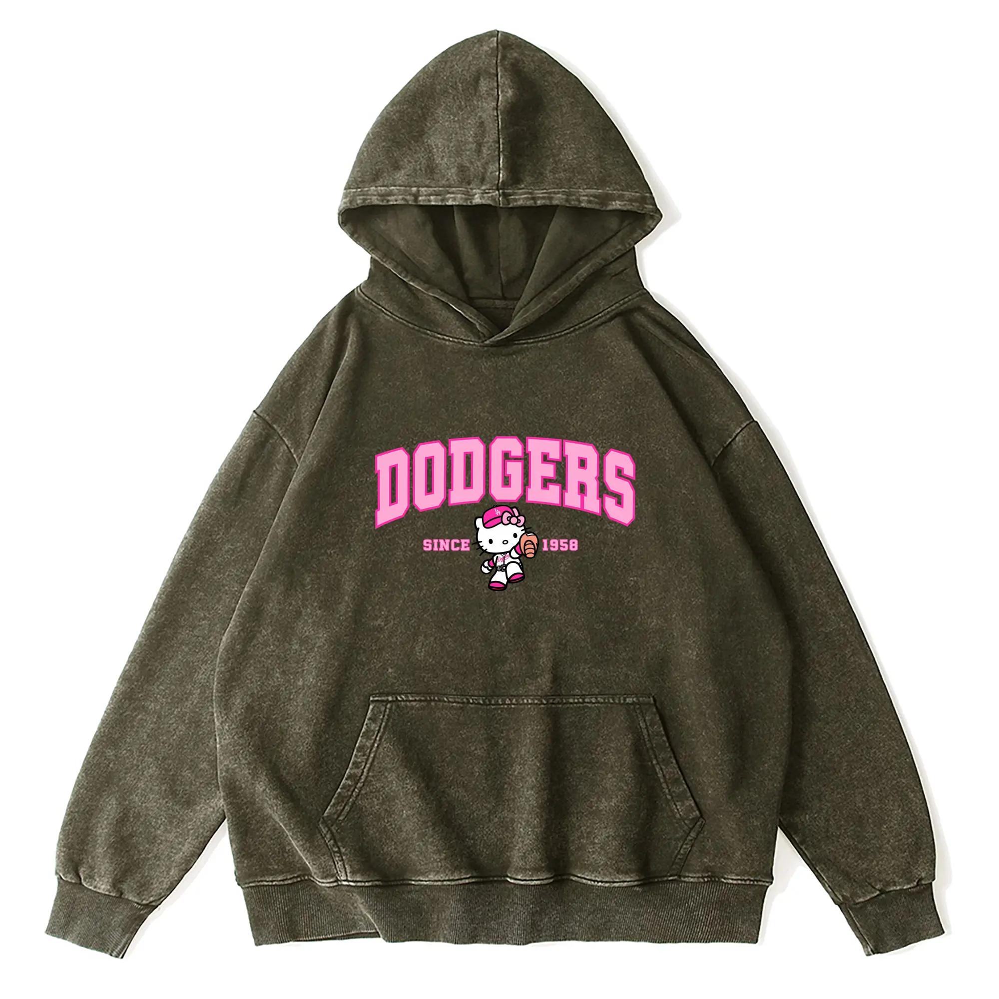 Pink Baseball Hello Kitty Dodgers - Vintage Washed Wax-Dyed Hoodie – 80% Cotton, 20% Polyester – Soft, Durable & Stylish – Perfect For Sports, Casual & Everyday Wear